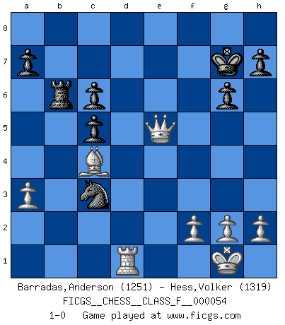Last move : 1-0 2008 February 26 23:56:16 [Event "FICGS__CHESS__CLASS_F__000054"] [Site "FICGS"] [Date "2008.02.14"] [Round "1"] [White "Barradas,Anderson"] [Black "Hess,Volker"] [Result "1-0"] [WhiteElo "1251"] [BlackElo "1319"] 1.e4 d6 2.d4 Nf6 3.Nc3 g6 4.Nf3 Bg7 5.Be2 O-O 6.O-O e5 7.Bg5 exd4 8.Nxd4 Qe8 9.Bd3 Nfd7 10.Ndb5 Na6 11.Rb1 c6 12.Nxd6 Qe5 13.Nxc8 Raxc8 14.Qg4 Ndc5 15.Bf4 Qe6 16.Qxe6 fxe6 17.Bd6 Rfd8 18.e5 Nd7 19.Rfe1 Nb6 20.Ne4 Nd5 21.a3 Bf8 22.c4 Nf4 23.Be2 Bxd6 24.exd6 b6 25.c5 Nxc5 26.Nxc5 bxc5 27.Rbd1 Nd5 28.Ba6 Rb8 29.Rxe6 Rxb2 30.d7 Rb6 31.Re8+ Rxe8 32.dxe8Q+ Kg7 33.Bc4 Nc3 34.Qe5+ 1-0 Pirc : Classical system, 5.Be2 Kingside Castling by player Black (move 5) Kingside Castling by player White (move 6) Promotion Queen by player White (move 32) Player White won this chess game. Follow this game move after move (download)Some part of a mistake is always correct. (Savielly Tartakover) Schach ist ein schwarz-weisser Dschungel. (Garry Kasparov) Cuando me preguntan: -¿Cual es el secreto que te hace hacer mejores movidas que tus oponentes?, Yo respondo: Me da gusto que me pregunten eso, porque, como veran, hay una simple razón. Yo pienso mis propias movidas y dejo a mi oponente que el piense las suyas. (Alexander Alekhine) Les ravages du H expliquent la différence de niveau entre Tal et Thal [Abergel]. All art requires courage. (Anne Tucker)