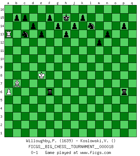 Last move : 0-1 2008 October 24 18:46:53 [Event "FICGS__BIG_CHESS__TOURNAMENT__000018"] [Site "FICGS"] [Date "2008.02.15"] [Round "1"] [White "Willoughby,Peter"] [Black "Koslowski,Volker"] [Result "0-1"] [WhiteElo "1639"] [BlackElo ""] 1.j2-h4 g15-g14 2.e2-e4 h16-f14 3.f2-f3 n15-n14 4.m2-m4 o16-c5 5.l2-l4 d15-d14 6.q2-q4 f14-f7 7.k1-l3 p16-o14 8.b2-b3 c5-f2 9.e1-e2 f2-d4 10.b1-c3 c16-h11 11.p2-p3 g16-f14 12.h4-f5 d4-b6 13.c3-d5 b6-g11 14.o1-q3 h11-c6 15.f5-e7 f7-g7 16.c2-c3 c6-b5 17.e2-e1 b5-e8 18.e7-f5 g7-l7 19.h3-h4 e8-m1 20.l3-m1 l7-k7 21.p1-o3 k7-n10 22.o3-n5 n10-m9 23.l1-n3 m9-h9 24.q1-p1 b16-d15 25.h1-k3 d15-c13 26.d2-d4 k16-l14 27.f1-c4 h9-g10 28.g2-g4 h14-h13 29.c1-h6 f16-m10 30.q3-p2 g10-h10 31.h6-m10 h10-m10 32.o2-o4 j15-k13 33.p2-h9 k13-j11 34.h9-e6 j11-g10 35.d5-f6 g10-f8 36.e6-f7 g11-d8 37.e4-e5 d8-a5 38.b3-b4 a5-f10 39.m4-m5 f10-j7 40.n3-j7 m10-j7 41.p1-o1 f8-g10 42.g4-g5 g10-h8 43.f7-h9 f14-g12 44.f6-g8 j7-l9 45.g8-e9 g12-j11 46.n5-m7 l9-o9 47.m7-k8 j11-h9 48.k8-h9 o9-m11 49.h9-g7 m15-m13 50.g1-h3 n14-n13 51.m1-l3 l16-q11 52.h2-j4 m11-b11 53.h3-j5 b11-c12 54.f5-d6 c12-c7 55.g7-e6 c7-e9 56.k3-k4 e9-f10 57.f3-f4 q11-p12 58.o1-o3 h8-j6 59.k4-k6 f10-h8 60.j5-g6 h8-h10 61.a2-a4 h10-l10 62.h4-h5 j6-l7 63.e1-h1 l7-j8 64.k6-l5 l10-l5 65.j4-l5 j8-k6 66.k2-k3 k6-h5 67.j3-j4 h5-j3 68.h1-h2 p12-f3 69.j1-k2 j3-g4 70.h2-h3 f3-a8 71.a4-a5 a8-f13 72.h3-h4 g4-e3 73.c4-b5 e3-d5 74.c3-c4 d5-b4 75.a5-a6 b4-c2 76.a1-a2 c2-e3 77.l3-k5 f13-k9 78.k5-j7 k9-j10 79.e6-f8 j10-p4 80.o3-o2 o14-n12 81.n2-n3 m13-m12 82.o2-o1 m16-m13 83.a2-e2 e3-c4 84.b5-c4 m13-l13 85.l5-n6 q16-o16 86.j7-l6 p4-n6 87.m5-n6 l13-l6 88.o4-o5 l6-m6 89.k2-j3 m6-m10 90.h4-h7 m10-p10 91.e2-p2 a15-a13 92.p3-p4 o15-o13 93.p4-p5 a16-a14 94.o5-o6 a14-b14 95.q4-q5 o16-o14 96.o1-o5 o14-q14 97.q5-q6 q14-q6 98.h7-h2 q6-q1 99.o6-o7 b14-b1 100.p2-q2 p10-k10 101.c4-h9 b1-j1 102.h2-j2 j1-j2 103.q2-j2 q1-d1 104.d6-f5 d1-d3 105.j3-h4 d3-k3 106.o5-n5 k3-k2 107.j2-k2 k10-k2 108.f5-h6 k2-d2 109.d4-d5 d2-a2 110.h9-f11 h15-g13 111.f11-c8 e15-e13 112.p5-p6 a2-h2 113.h4-j5 e16-e14 114.e5-e6 e14-f14 115.n5-q5 n12-o14 116.p6-p7 h2-n2 117.q5-q3 f14-f10 118.l4-l5 n2-d2 119.h6-g8 f10-n10 120.g6-e7 n10-n6 121.g8-h6 n6-n7 122.e7-g8 n7-o7 123.p7-p8 d2-d5 124.f8-g6 o7-p7 125.c8-b7 d5-d3 126.q3-o3 p7-p8 127.g6-e5 d3-l3 128.h6-k5 l3-l5 129.j5-k6 l5-l9 130.o3-o13 p8-g8 131.e5-f7 g8-g6 132.k5-h6 g6-e6 133.f4-f5 e6-e3 134.o13-p13 p15-p14 135.p13-p3 l9-k9 136.k6-j7 k9-j9 137.h6-j8 j9-n9 138.p3-o3 n9-n7 139.j7-h6 e3-n3 140.o3-o14 n7-f7 141.f5-f6 f7-p7 142.o14-o15 p7-p6 143.h6-h5 p6-p8 144.j8-g7 n3-h3 145.h5-g4 h3-j3 146.o15-q15 j3-j4 147.g4-f5 j4-a4 148.q15-l15 a4-a5 149.f5-g6 p8-p6 150.g6-f7 a5-g5 151.g7-e8 g13-h11 152.l15-l16 j16-h15 153.l16-a16 h11-g9 154.e8-g9 g5-g9 155.a16-a13 g9-f9 156.f7-e8 f9-f6 0-1 Follow this game move after move (download)The Chess pieces are the block alphabet which shapes thoughts; and these thoughts, although making a visual design on the chessboard, express their beauty abstractly, like a poem. (Marcel Duchamp) Ich war zu klein für die Schach-Schülermannschaft! (Woody Allen) Yo creo que el Ajedrez posee una magia que es también una ayuda en la edad avanzada. Una rodilla reumática es olvidada durante una partida de Ajedrez y otros eventos pueden parecer algo sin importancia comparada a una catástrofe en el tablero de Ajedrez. (Vlastimil Hort) Les échecs sont utiles à l'exercice de la faculté de penser et à celle de l'imagination. Car nous devons posséder une méthode élaborée pour atteindre des buts partout où nous devons conduire notre raison. (Leibnitz) The various flowers seem good to different people. (Chinese proverb)