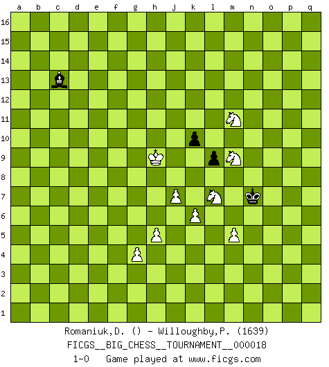 Last move : 1-0 2009 January 19 22:25:6 [Event "FICGS__BIG_CHESS__TOURNAMENT__000018"] [Site "FICGS"] [Date "2008.02.15"] [Round "1"] [White "Romaniuk,Dmytro"] [Black "Willoughby,Peter"] [Result "1-0"] [WhiteElo ""] [BlackElo "1639"] 1.h3-h4 j15-h13 2.j2-k4 m15-m13 3.h1-m5 e15-e13 4.m5-l5 l15-l14 5.m2-m4 d15-d13 6.l1-o4 f16-d14 7.n2-n3 n15-n13 8.l5-f10 h15-k14 9.f10-f15 g16-f14 10.f15-g14 k16-h15 11.g2-g3 o16-k12 12.f1-l6 e13-e12 13.o4-d14 c15-d14 14.e2-e4 e16-e14 15.e1-e3 f14-g16 16.g14-g6 p16-o14 17.g1-h3 b16-c14 18.e3-f3 l16-p12 19.f3-d3 e14-e13 20.o1-b13 a15-a14 21.b13-c14 b15-c14 22.p1-o3 p15-p14 23.g6-h6 c16-l8 24.d3-c3 c14-c13 25.d2-d4 g15-g14 26.m1-m3 h13-f12 27.m3-k3 e13-h13 28.h6-p13 o14-m15 29.k4-m5 q15-q14 30.p13-k8 k12-h10 31.k8-b8 g16-f14 32.b1-a3 a16-b16 33.b8-a8 l8-j6 34.h3-g5 j6-h5 35.j3-j4 h5-m9 36.a8-a14 h16-d16 37.a14-f9 g14-g13 38.a1-b1 m9-k11 39.k3-k11 m15-l13 40.k11-k3 d16-a13 41.c1-f4 j16-j15 42.k1-j3 b16-b12 43.q1-m1 m16-b16 44.l6-n8 k14-j12 45.n8-j12 l13-j12 46.f9-j12 q14-q13 47.j12-k11 h15-j13 48.k11-n11 l14-l13 49.n11-n13 m13-m12 50.f4-c7 a13-b14 51.c3-b3 b12-b3 52.a2-b3 q16-m16 53.c7-j13 h13-j13 54.m1-m3 m16-n16 55.n13-l15 j13-k13 56.k3-k13 j14-k13 57.l15-o15 p12-o13 58.m3-k3 k13-k12 59.b1-e1 n16-o16 60.o15-l12 b16-l16 61.e1-e3 b14-b13 62.l2-l4 o16-n16 63.a3-c4 o13-n14 64.l12-l10 h10-j11 65.l10-p14 n14-p12 66.p14-h7 b13-h7 67.g5-h7 h14-h13 68.j1-j2 d13-d12 69.h4-h5 n16-n9 70.e3-f3 l16-o16 71.k3-k8 n9-h9 72.h7-j5 p12-o13 73.c4-e3 o13-e4 74.f3-f6 e4-b7 75.f6-b6 b7-f11 76.b6-b14 f12-d13 77.b14-d14 j11-h10 78.d14-f14 h10-k8 79.f14-f15 j15-k14 80.f15-f13 d13-e15 81.f13-g13 c13-c12 82.h2-g4 c12-c11 83.j2-h3 d12-d11 84.k2-k4 f11-g12 85.j3-k5 e15-f13 86.g13-g14 k14-k13 87.g14-e14 e12-e11 88.h3-h4 h9-g9 89.j5-h7 k8-e3 90.h7-g9 e3-d4 91.c2-c3 d4-a7 92.e14-q14 o16-o13 93.q14-a14 a7-d10 94.j4-j5 d10-c9 95.h4-j4 c9-g5 96.m5-k6 o13-o9 97.k6-h7 g5-c1 98.a14-a11 c11-c10 99.a11-d11 c1-b2 100.d11-c11 g12-d9 101.c3-c4 q13-q12 102.k5-h6 b2-l11 103.h6-f7 k15-k14 104.g4-h6 o9-p9 105.h7-f8 d9-g12 106.c11-c10 p9-p2 107.c10-q10 l11-n9 108.o3-n5 p2-o2 109.q10-q9 n9-p11 110.h6-j8 o2-f2 111.j8-h10 g12-n6 112.q9-l9 f2-q2 113.b3-b4 q2-c2 114.l9-l6 n6-p8 115.l6-c6 k13-l14 116.b4-b5 c2-n2 117.b5-b6 n2-n3 118.g3-g4 p8-o9 119.k4-k5 n3-n1 120.j5-j6 p11-g3 121.c6-c13 f13-g11 122.c13-e13 e11-e10 123.f8-e10 g11-e10 124.e13-e10 o9-q7 125.c4-c5 q7-k1 126.f7-h6 g3-j1 127.n5-l6 n1-n3 128.h10-g8 k1-l2 129.j4-k4 j1-h2 130.k4-j5 n3-l3 131.h6-j4 l2-j4 132.j5-j4 l3-l4 133.j4-h3 h2-g1 134.e10-c10 l14-k13 135.b6-b7 g1-d4 136.c5-c6 d4-c5 137.g9-h7 l4-l3 138.h3-h4 c5-f2 139.h4-g5 l3-k3 140.k5-k6 k3-l3 141.g8-j7 l3-q3 142.b7-b8 f2-b6 143.c6-c7 q12-q11 144.b8-b9 q11-q10 145.b9-b10 q10-q9 146.b10-b11 b6-c5 147.c7-c8 q9-q8 148.c8-c9 q8-q7 149.b11-b12 c5-j11 150.c10-q10 j11-d16 151.c9-c10 q7-q6 152.c10-c11 q6-q5 153.l6-n5 q5-q4 154.n5-p6 k13-j12 155.c11-c12 j12-h11 156.c12-c13 q3-b3 157.p6-q4 b3-b12 158.q4-o5 b12-c12 159.q10-q16 d16-e15 160.q16-c16 c12-c13 161.c16-c13 e15-c13 162.g5-g6 k14-k13 163.g6-g7 l13-l12 164.o5-m6 k12-k11 165.g7-g8 k13-k12 166.m6-l8 m12-m11 167.g8-h9 l12-l11 168.m4-m5 k11-k10 169.l8-n9 m11-m10 170.n9-l10 h11-j12 171.j7-k9 j12-k11 172.l10-k8 h13-h12 173.k9-h10 k11-l12 174.k8-j10 h12-h11 175.j10-g9 k12-k11 176.g9-h11 c13-b12 177.h11-j13 l12-k12 178.j13-k11 m10-m9 179.k11-h12 b12-e15 180.h12-j10 k12-l12 181.h10-k9 l11-l10 182.k9-h10 l12-m11 183.h7-k8 e15-c13 184.j6-j7 m11-m10 185.j10-k12 l10-l9 186.h10-k9 m10-n9 187.k12-m11 n9-n8 188.k9-l7 n8-n7 189.k8-m9 1-0 Follow this game move after move (download)Only the player with the initiative has the right to attack. (Wilhelm Steinitz) Schach verlangt totale Konzentration. (Robert James Fischer) En el Ajedrez, tal como es jugado por los Maestros, practicamente la suerte es eliminada. (Emanuel Lasker) Celui qui prend des risques peut perdre, celui qui n'en prend pas perd toujours. (Xavier Tartacover) Whenever people agree with me, I always feel I must be wrong. (Oscar Wilde)