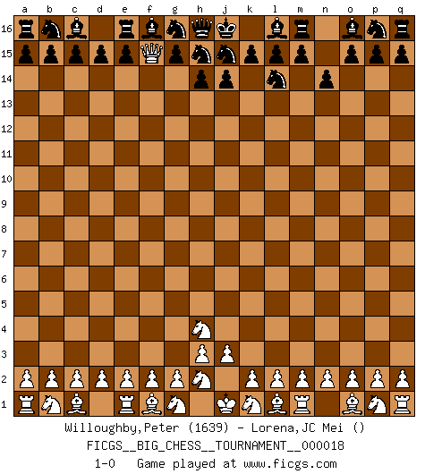 Last move : 1-0 2008 March 20 4:45:37 [Event "FICGS__BIG_CHESS__TOURNAMENT__000018"] [Site "FICGS"] [Date "2008.02.15"] [Round "1"] [White "Willoughby,Peter"] [Black "Lorena,JC Mei"] [Result "1-0"] [WhiteElo "1639"] [BlackElo ""] 1.j2-h4 k16-l14 2.h1-o7 n15-n14 3.o7-f15 1-0 This big chess game has been lost on time (started : 2008.02.15 0:7:40) Follow this game move after move (download)Chess is the gymnasium of the mind. (Blaise Pascal) Kasparov ist eine Art Monster mit hundert Augen, denen auch nicht das Geringste entgeht. (Tony Miles) Botvinnik trataba de restarle el misterio al Ajedrez, siempre relacionandolo a situaciones de la vida ordinaria. El gustaba de llamar al Ajedrez un típico problema inexacto similar a aquellos de los cuales la gente siempre tiene que enfrentarse en la vida cotidiana. (Garry Kasparov) Des idées, des idées, j'en ai cent, j'en ai mille. Des bonnes, des mauvaises, applicables, irréalisables... Il suffit de faire le tri ! (Roos) Creativity is allowing yourself to make mistakes. Art is knowing which ones to keep. (Scott Adams)