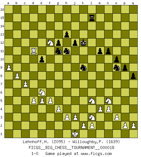 Last move : 1-0 2008 May 1 2:10:9 [Event "FICGS__BIG_CHESS__TOURNAMENT__000018"] [Site "FICGS"] [Date "2008.02.15"] [Round "1"] [White "Lehnhoff,Heinz-Georg"] [Black "Willoughby,Peter"] [Result "1-0"] [WhiteElo "2095"] [BlackElo "1639"] 1.j2-k4 j15-h13 2.h1-o7 p16-o14 3.o7-l7 b16-c14 4.l7-l15 k16-l14 5.l15-f10 f15-f14 6.e2-e4 e15-e13 7.f1-b5 j14-j13 8.m2-m4 b15-b14 9.f10-a10 m15-m13 10.a10-f15 e16-e15 11.f15-h13 g16-j15 12.h13-p6 d15-d13 13.n2-n4 n15-n13 14.d2-d4 c16-f13 15.e4-e5 k15-k13 16.o1-j6 l16-g12 17.p1-o3 p15-p14 18.l1-p5 o16-k12 19.b1-c3 g12-h13 20.p6-o6 m16-m14 21.j6-k7 f13-e12 22.b5-g10 e12-g10 23.k7-g10 e13-e12 24.c1-l9 h13-j12 25.g10-j12 k13-j12 26.o6-c6 e15-e14 27.c6-j12 h15-k14 28.j12-j10 a16-e16 29.p5-o4 c14-e13 30.m1-m3 h16-g16 31.c3-d5 f16-d14 32.l9-j11 k14-h13 33.j11-k12 l14-k12 34.j10-a10 e13-c14 35.o4-d14 e14-d14 36.o3-n5 d13-d12 37.a10-g16 j15-g16 38.m3-l3 o14-n12 39.e1-e4 o15-o13 40.k4-j6 j16-k15 41.q1-n1 g16-j15 42.a1-e1 q16-l16 43.e4-l4 l16-l4 44.l3-l4 e16-l16 45.e1-e4 m14-l14 46.n1-n3 h13-j11 47.j6-l5 j11-l12 48.n3-q3 q15-q13 49.q3-q8 l12-m10 50.l4-g4 g15-g13 51.e4-f4 n12-l11 52.g4-g10 l11-n12 53.g10-c10 m10-o9 54.q8-c8 c14-b12 55.c10-c15 a15-a13 56.c15-f15 k12-h13 57.c8-c15 k15-j14 58.c2-c3 l14-k14 59.f15-d15 d14-d15 60.c15-d15 d12-d11 61.d15-d14 b14-b13 62.d14-b14 b12-c10 63.b14-b13 a13-a12 64.f4-f9 n12-m10 65.h2-j4 c10-e11 66.f9-e9 l16-l11 67.b13-a13 k14-k9 68.e9-k9 m10-k9 69.a13-a12 f14-f13 70.g1-f3 n13-n12 71.f3-g5 p14-p13 72.f2-f4 o13-o12 73.g2-g4 p13-p12 74.f4-f5 m13-m12 75.o2-o3 q13-q12 76.a2-a4 n12-n11 77.a4-a5 o12-o11 78.b2-b4 p12-p11 79.g5-e6 q12-q11 80.a5-a6 o11-o10 81.b4-b5 j15-k13 82.b5-b6 k13-j11 83.e6-d8 h13-f12 84.d5-e7 p11-p10 85.e7-f9 e11-f9 86.d8-f9 f12-e10 87.k1-l3 q11-q10 88.j4-g5 j11-h9 89.g5-e6 m12-m11 90.c3-c4 e10-c11 91.a12-c12 c11-e10 92.a6-a7 e10-f12 93.a7-a8 e12-e11 94.b6-b7 e11-e10 95.f9-d10 q10-q9 96.c4-c5 j13-j12 97.c5-c6 p10-p9 98.c6-c7 l11-l15 99.b7-b8 q9-q8 100.a8-a9 h9-g11 101.d4-d5 h14-h13 102.d10-f11 f12-h11 103.c12-d12 g13-g12 104.f11-h12 j14-j13 105.h12-g14 j13-k12 106.d12-d11 f13-f12 107.g14-f12 1-0 Follow this game move after move (download)I still hope to kill Fischer. (Boris Spassky) Ich kenne keine einzige Person, die behaupten würde, Garri Kasparow sei ein guter Mensch (Nigel Short) Al jugar al Ajedrez entonces, podemos aprender: Primero: Previsión... Segundo: Prudencia... Tercero: Cautela... Y al final, aprendemos del Ajedrez el hábito de no ser desanimados por apariencias malas presentes en el estado de nuestros asuntos, el hábito de la esperanza por una oportunidad favorable y la perseveración de los secretos de los recursos. (Benjamin Franklin) Dans le domaine de la peinture, de la gravure et de la sculpture, dès la première décennie de notre siècle, les artistes abandonnent la représentation de la partie d'échecs pour se concentrer sur les pièces, sur les échiquiers et sur toutes les variations auxquelles les unes et les autres peuvent donner lieu. On passe en quelque sorte d'un thème social à un thème musical (au sens de la musica médiévale, c'est-à-dire d'une notion qui inclue le rythme, l'harmonie, la construction et la déconstruction, etc.). Graphiquement et picturalement, l'échiquier apparaît comme une structure ouverte, dynamique, d'une richesse infinie, autorisant toutes les combinatoires et débouchant sur des mouvements et des rythmes de nature exponentielle. (Michel Pastoureau) I have opinions of my own - strong opinions - but I don't always agree with them. (George Bush)
