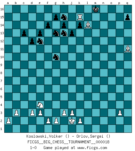 Last move : 1-0 2008 April 21 16:39:24 [Event "FICGS__BIG_CHESS__TOURNAMENT__000018"] [Site "FICGS"] [Date "2008.02.15"] [Round "1"] [White "Koslowski,Volker"] [Black "Orlov,Vladimir"] [Result "1-0"] [WhiteElo ""] [BlackElo ""] 1.j2-h4 j15-k13 2.h1-o7 h15-g13 3.o7-o15 p16-o14 4.o15-f7 b16-c14 5.n2-n4 g16-f14 6.b1-c3 e15-e13 7.p1-o3 d15-d13 8.d2-d3 n15-n13 9.m2-m4 f16-c13 10.f7-c10 f14-e12 11.c10-d9 c16-e14 12.k1-l3 k15-k14 13.l1-o4 j14-j13 14.d9-b11 c14-a13 15.b11-b13 a13-c12 16.b13-b15 c13-b14 17.o1-f9 e12-c13 18.b15-c14 l16-d9 19.c14-b13 d9-l2 20.m1-l1 l2-a12 21.b13-b9 h16-h15 22.b9-h15 k16-h15 23.f9-k13 c13-e12 24.c1-h6 o16-g9 25.l3-m5 g9-m4 26.o3-m4 b14-m4 27.l1-l15 m16-l16 28.l15-l16 q16-l16 29.o4-n3 m4-n3 30.m5-n3 j16-j15 31.b2-b3 l16-l13 32.k13-n10 e16-l16 33.g1-f3 l13-l1 34.q1-l1 l16-l1 35.h2-k1 a16-l16 36.h6-g7 l1-q1 37.q2-q3 l16-l1 38.f3-h2 m15-m14 39.g7-l3 a12-l2 40.n3-l2 l1-l2 41.l3-m4 q1-q2 42.n10-h5 l2-l4 43.m4-a15 l4-n4 44.h5-k7 n4-n1 45.a15-g9 q2-q1 46.g9-m14 e14-o5 47.j1-j2 o5-k1 48.h2-k1 n1-k1 49.m14-n13 k1-n1 50.n13-j9 n1-n7 51.k7-g10 c12-e11 52.g10-c6 n7-p7 53.j9-h8 d13-d12 54.c6-d5 q1-p1 55.h8-j9 f15-f14 56.p2-p3 e11-g10 57.j9-e5 p7-o7 58.e5-f4 g10-h12 59.e2-e3 p1-p2 60.f4-k8 o7-o2 61.k8-n5 o2-n2 62.d5-h9 p2-q2 63.n5-m4 q2-q3 64.h9-o3 n2-m2 65.m4-n5 m2-o2 66.o3-k7 o2-n2 67.k7-l8 q3-q2 68.n5-m4 n2-n8 69.f1-e2 q2-q9 70.e1-q1 q9-c9 71.m4-h8 c9-c8 72.h4-g6 h12-g10 73.l8-m7 n8-h8 74.g6-h8 g10-h8 75.c3-e4 c8-c2 76.e2-h5 h8-g10 77.a1-c1 c2-c1 78.q1-c1 c15-c13 79.c1-n1 o14-m13 80.h5-o11 m13-k12 81.n1-n15 j15-k16 82.n15-p15 k12-h13 83.p15-k15 k16-l16 84.m7-q11 l16-m16 85.o11-l14 1-0 Follow this game move after move (download)When I have White, I win because I am white; When I have Black, I win because I am Bogolyubov. (Bogolyubov) Schon mancher Spieler hat aufgegeben, um zu vermeiden, daß er eine Figur verliert. (Savielly Grigorievitsch Tartakower) Sin errores no puede haber brillantez. (Emanuel Lasker) C'est la seule position que je connaisse où les deux camps sont mals. Propos prêtés à V. Anand. Children in the dark cause accidents, accidents in the dark cause children. (Unknown)