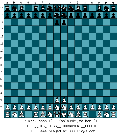 Last move : 0-1 2008 March 17 16:27:27 [Event "FICGS__BIG_CHESS__TOURNAMENT__000018"] [Site "FICGS"] [Date "2008.02.15"] [Round "1"] [White "Nyman,Johan"] [Black "Koslowski,Volker"] [Result "0-1"] [WhiteElo ""] [BlackElo ""] 0-1 This big chess game has been lost on time (started : 2008.02.15 0:7:40) Follow this game move after move (download)Examine moves that smite! A good eye for smites is far more important than a knowledge of strategical principles. (Purdy) Ich bin es gewohnt, das die Jugend mir überhaupt keinen Respekt entgegenbringt. (Alexander Morozewich) EL Ajedrez es como la vida. (Boris Spassky) J'ai toujours senti une vague pitié pour l'homme qui ne connaît rien aux échecs, tout comme j'en aurais pour un homme ignorant de l'amour. Les Echecs, comme la musique ou comme l'amour, ont le pouvoir de rendre heureux. (Siegbert Tarrasch) Cactus - It is depressed cucumber. (Ilmars Cirulis)