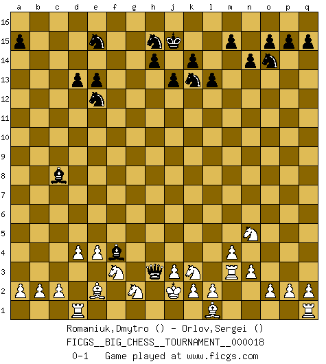Last move : 0-1 2008 April 8 10:33:53 [Event "FICGS__BIG_CHESS__TOURNAMENT__000018"] [Site "FICGS"] [Date "2008.02.15"] [Round "1"] [White "Romaniuk,Dmytro"] [Black "Orlov,Vladimir"] [Result "0-1"] [WhiteElo ""] [BlackElo ""] 1.j2-h4 j15-k13 2.h1-l4 l15-l14 3.e2-e4 e15-e13 4.f1-c4 n15-n14 5.d2-d3 c15-c14 6.l4-f9 h15-g13 7.c1-k8 f16-c13 8.n2-n3 d15-d13 9.f9-e8 g15-g14 10.e1-e3 p16-o14 11.e3-f3 k16-h15 12.m2-m4 o16-c5 13.b1-d2 c16-h11 14.e8-b8 c5-g9 15.b8-b15 h11-c16 16.b15-a16 c13-d14 17.o1-b13 c16-d15 18.a16-b15 g9-b14 19.k8-g11 k15-k14 20.g11-f10 b14-f10 21.f3-f10 d14-c13 22.f10-c10 g13-e12 23.b13-c14 d15-c14 24.b15-f15 e16-f16 25.f15-g14 f16-f2 26.g1-f3 c14-a12 27.c10-b10 g16-e15 28.g14-g3 f2-e2 29.h2-k3 c13-j7 30.a1-d1 h16-f14 31.b10-b16 j16-j15 32.d3-d4 j7-f4 33.c4-e2 f4-g3 34.j1-j2 l16-k15 35.b16-m16 q16-m16 36.p1-o3 m16-g16 37.o3-n5 l14-l13 38.k1-h2 f14-j11 39.h2-j4 a12-j4 40.h3-j4 j11-j4 41.m1-m3 j14-j13 42.f3-g5 k15-c8 43.g5-h3 g3-f4 44.d2-f3 g16-g2 45.h4-g2 j4-h3 0-1 Follow this game move after move (download)Later, I began to succeed in decisive games. Perhaps because I realized a very simple truth: not only was I worried, but also my opponent. (Mikhail Tal) Es liegt in der Natur, vernüftig zu denken und unlogisch zu handeln. (Anatole France) El Ajedrez tiene tanto misterio como las mujeres. (Purdy) Un millionnaire : 'Monsieur Steinitz ! Vous ne participez aux tournois que pour l'argent, alors que moi je n'y viens que pour l'honneur.' Steinitz : 'Chacun joue pour ce qu'il n'a pas'... Now be brave and don't look back. Don't look back. (Shmi Skywalker in Star Wars ep.1)