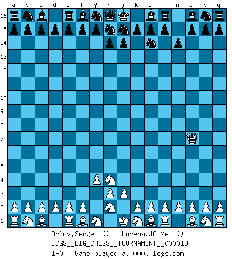 Last move : 1-0 2008 March 20 16:47:45 [Event "FICGS__BIG_CHESS__TOURNAMENT__000018"] [Site "FICGS"] [Date "2008.02.15"] [Round "1"] [White "Orlov,Vladimir"] [Black "Lorena,JC Mei"] [Result "1-0"] [WhiteElo ""] [BlackElo ""] 1.j2-h4 k16-l14 2.g2-g4 n15-n14 3.h1-o7 1-0 This big chess game has been lost on time (started : 2008.02.15 0:7:40) Follow this game move after move (download)Chess is a part of culture and if a culture is declining then Chess too will decline. (Mikhail Botvinnik) Der Partner hat auch seine Existenzberechtigung. (Savielly Grigorievitsch Tartakower) El Ajedrez es un juego de pelea el cual es puramente intelectual e incluye la suerte. (Richard Reti) Je menace de comprendre la position. (Anonyme) Perhaps the current trend of many chess professionals taking up the more lucrative pastime of poker is not a wholly negative one. It may not be too late for humans to relearn how to take risks in order to innovate and thereby maintain the advanced lifestyles we enjoy. And if it takes a poker-playing supercomputer to remind us that we can't enjoy the rewards without taking the risks, so be it. (The Chess Master and the Computer, by Garry Kasparov - 2010)
