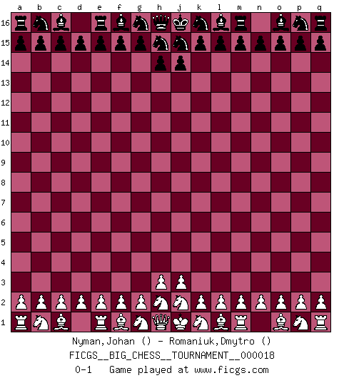 Last move : 0-1 2008 March 17 16:27:27 [Event "FICGS__BIG_CHESS__TOURNAMENT__000018"] [Site "FICGS"] [Date "2008.02.15"] [Round "1"] [White "Nyman,Johan"] [Black "Romaniuk,Dmytro"] [Result "0-1"] [WhiteElo ""] [BlackElo ""] 0-1 This big chess game has been lost on time (started : 2008.02.15 0:7:40) Follow this game move after move (download)The passed Pawn is a criminal, who should be kept under lock and key. Mild measures, such as police surveillance, are not sufficient. (Aaron Nimzovich) Wie kann ich Remis annehmen? Ich weiß ja gar nicht, wie ich stehe! (Fritz Sämisch) No soy una persona materialista y por eso, no resiento la falta o pérdida del dinero. La ausencia de cosas mundanas carece de importancia. Ya que el Ajedrez es una forma en la que puedo ser tan materialista como yo desee sin tener la necesidad de vender mi alma. (Jamie Walter Adams) A ce moment-là, je menaçais de comprendre la position ! (Clément L'Heureux) Knowledge will give you power, but character respect. (Bruce Lee)