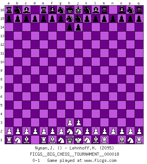 Last move : 0-1 2008 March 17 16:27:27 [Event "FICGS__BIG_CHESS__TOURNAMENT__000018"] [Site "FICGS"] [Date "2008.02.15"] [Round "1"] [White "Nyman,Johan"] [Black "Lehnhoff,Heinz-Georg"] [Result "0-1"] [WhiteElo ""] [BlackElo "2095"] 0-1 This big chess game has been lost on time (started : 2008.02.15 0:7:40) Follow this game move after move (download)You cannot play at Chess if you are kind-hearted. (French Proverb) Die Leute spielen gegen mich seit 15 Jahren unter Ihren Möglichkeiten. (Robert James Fischer) Yo no le temo a Spassky. Todos saben que yo soy el mejor. Uno no necesita un torneo para probarlo. (Bobby Fischer) Echiquier : carré parfait, comme la Jérusalem nouvelle décrite par l'auteur de l'Apocalypse, huit cases sur huit, exaltation du chiffre 4, symbole du cosmos aux quatre horizons... où le noir et le blanc, l'ombre et la lumière, le mal et le bien s'entremêlent et se conjuguent. (Robert Couffignal, Le Gambit du poète) 'preceded by its own quotation yields a falsehood' preceded by its own quotation yields a falsehood. (W. V. O. Quine - Set Theory And Its Logic, 1953)