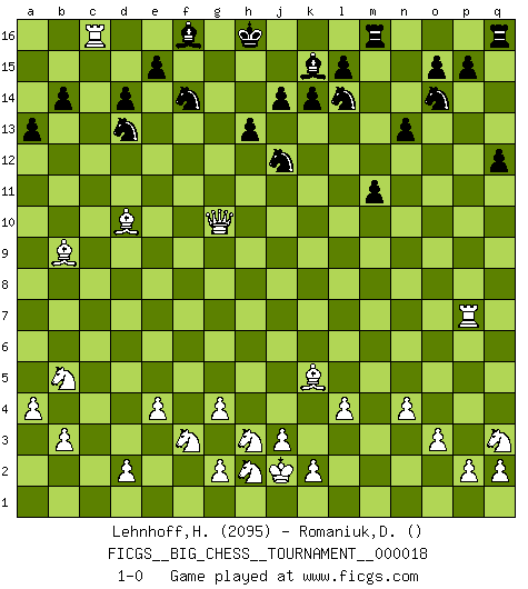 Last move : 1-0 2008 May 23 7:14:4 [Event "FICGS__BIG_CHESS__TOURNAMENT__000018"] [Site "FICGS"] [Date "2008.02.15"] [Round "1"] [White "Lehnhoff,Heinz-Georg"] [Black "Romaniuk,Dmytro"] [Result "1-0"] [WhiteElo "2095"] [BlackElo ""] 1.j2-k4 g15-g13 2.h1-o7 j15-h13 3.m2-m4 p16-o14 4.o7-l7 k16-l14 5.l7-c15 d15-d14 6.c15-c7 k15-k14 7.e2-e4 h16-f14 8.h2-g4 c16-l8 9.k1-h2 e16-c16 10.c7-b7 b15-b14 11.n2-n4 m15-m13 12.b7-j7 b16-d15 13.o1-a14 c16-c2 14.b1-c3 l8-g4 15.h3-g4 f14-f2 16.g1-f3 d15-c13 17.a14-k5 n15-n13 18.f1-d3 c2-c1 19.a1-c1 f2-o10 20.p1-q3 a16-c16 21.c3-b5 h15-j13 22.o2-o3 o16-f8 23.k4-h3 g16-f14 24.l1-p5 o10-d10 25.d3-c4 f8-h6 26.j7-m7 c13-e14 27.c4-d5 c16-c1 28.e1-c1 j16-h15 29.m7-f13 h15-g15 30.j1-j2 l16-k15 31.f13-d11 d10-g10 32.a2-a4 e14-f12 33.d11-d6 h6-m10 34.l2-l4 h13-g11 35.c1-c15 a15-a13 36.m1-c1 g10-g7 37.b2-b3 q15-q13 38.c1-c7 g7-h8 39.c7-h7 h8-j8 40.d6-h10 j13-k11 41.d5-k11 m10-j13 42.q1-c1 q13-q12 43.c1-c8 j8-m11 44.h10-l10 m11-m4 45.k11-f15 h14-h13 46.f15-a10 m13-m12 47.p5-g13 f12-d13 48.c15-c16 g11-j12 49.g13-d10 m12-m11 50.l10-g10 g15-h15 51.a10-b9 h15-h16 52.c16-f16 j13-f16 53.c8-c16 m4-p7 54.h7-p7 1-0 Follow this game move after move (download)Bobby Fischer's current state of mind is indeed a tragedy. One of the world's greatest Chess players - the pride and sorrow of American Chess. (Frank Brady) Im Hotelzimmer gab es nur zwei Schaben. (Über die Turnierbedingungen) (Peter Swidler) Un buen jugador siempre tiene buena suerte. (José Raúl Capablanca) Nous vivons dans un monde échiquéen : chaque jour qui passe est un défi à relever. (Philosophe Sasha) Difficult things take a long time, impossible things a little longer. (Author unknown)