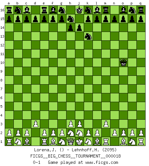 Last move : 0-1 2008 March 19 16:45:0 [Event "FICGS__BIG_CHESS__TOURNAMENT__000018"] [Site "FICGS"] [Date "2008.02.15"] [Round "1"] [White "Lorena,JC Mei"] [Black "Lehnhoff,Heinz-Georg"] [Result "0-1"] [WhiteElo ""] [BlackElo "2095"] 1.m2-m3 j15-k13 2.d2-d3 h16-o10 0-1 This big chess game has been lost on time (started : 2008.02.15 0:7:40) Follow this game move after move (download)A good sacrifice is one that is not necessarily sound but leaves your opponent dazed and confused. (Rudolph Spielmann) Wenn ein Kopf und ein Buch zusammenstoßen und es klingt hohl, ist es denn allemal im Buche? (Georg Christoph Lichtenberg) Tu eres para mi la Reina en d8 y yo soy el Peón en d7!!. (GM Eduard Gufeld) La guerre est enfant de la passion, la passion est enfant du narcissisme et le narcissisme est l'enfant. (...) Une autre partie ? (Thibault de Vassal) Industry executives and analysts often mistakenly talk about strategy as if it were some kind of chess match. But in chess, you have just two opponents, each with identical resources, and with luck playing a minimal role. The real world is much more like a poker game, with multiple players trying to make the best of whatever hand fortune has dealt them. In our industry, Bill Gates owns the table until someone proves otherwise. (David Moschella, 'Computerworld')