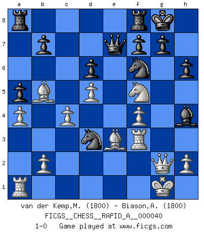 Last move : 1-0 2008 April 16 7:22:47 [Event "FICGS__CHESS__RAPID_A__000040"] [Site "FICGS"] [Date "2008.02.15"] [Round "1"] [White "van der Kemp,Michel"] [Black "Biason,Adriano"] [Result "1-0"] [WhiteElo "1800"] [BlackElo "1800"] 1.e4 c5 2.Nf3 d6 3.d4 cxd4 4.Nxd4 Nf6 5.Nc3 Bd7 6.f3 e5 7.Nb3 Be7 8.Be3 O-O 9.Qd2 a5 10.a4 Be6 11.Bb5 Nc6 12.Nd5 Bxd5 13.exd5 Nb4 14.c4 h6 15.O-O Nh5 16.g3 Bg5 17.f4 exf4 18.gxf4 Bh4 19.Rf3 Nf6 20.Qg2 Qe7 21.Nd4 Nd3 22.Nf5 1-0 Sicilian Kingside Castling by player Black (move 8) Kingside Castling by player White (move 15) Player White won this chess game. Follow this game move after move (download)The King is a fighting piece. Use it ! (Wilhelm Steinitz) Schach ist die gewalttätigste aller Sportarten. (Garry Kasparov) Si tu oponente te ofrece un empate, trata de averiguar porque piensa él que esta en una posición peor. (Nigel Short) Seul un grand joueur sait à quel point il joue faiblement. (Xavier Tartacover) Being number two sucks. (Andre Agassi)