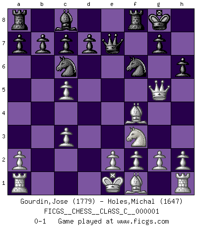 Last move : 0-1 2006 May 16 6:4:31 [Event "FICGS__CHESS__CLASS_C__000001"] [Site "FICGS"] [Date "2006.04.13"] [Round "1"] [White "Gourdin,Jose"] [Black "Holes,Michal"] [Result "0-1"] [WhiteElo "1779"] [BlackElo "1647"] 1.d4 Nf6 2.c4 e5 3.dxe5 Ng4 4.Bf4 Nc6 5.Nf3 Bb4+ 6.Nc3 Bxc3+ 7.bxc3 Qe7 8.Qd5 f6 9.exf6 Nxf6 10.Qg5 O-O 11.c5 h6 0-1 Budapest : Rubinstein variation Kingside Castling by player Black (move 10) Player Black won this chess game. Follow this game move after move (download)The passed Pawn is a criminal, who should be kept under lock and key. Mild measures, such as police surveillance, are not sufficient. (Aaron Nimzovich) Pläne sind die Träume des Verständigen. (Ernst Freiherr von Feuchtersleben) La batalla por la última verdad nunca sera ganada. Y es por eso que el Ajedrez es tan fascinante. (Hans Kmoch) Il vaut mieux sacrifier les pièces de l'adversaire. (Xavier Tartacover) 98% of all statistics are made up. (Author unknown)