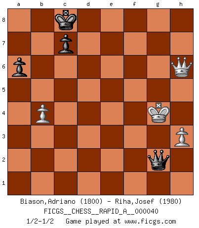 Last move : 1/2-1/2 2008 May 16 10:0:9 [Event "FICGS__CHESS__RAPID_A__000040"] [Site "FICGS"] [Date "2008.02.15"] [Round "1"] [White "Biason,Adriano"] [Black "Riha,Josef"] [Result "1/2-1/2"] [WhiteElo "1800"] [BlackElo "1980"] 1.e4 e5 2.Nf3 Nc6 3.Bb5 a6 4.Ba4 Nf6 5.O-O Nxe4 6.d4 b5 7.Bb3 d5 8.dxe5 Be6 9.Be3 Nc5 10.c3 Nxb3 11.axb3 Be7 12.Nbd2 O-O 13.b4 Qd7 14.Re1 Bg4 15.h3 Bh5 16.Qe2 Bg6 17.Nb3 Rfe8 18.Bf4 Nd8 19.Bg5 Bxg5 20.Nxg5 f6 21.Nf3 fxe5 22.Nxe5 Qd6 23.Nc5 Bf5 24.Qe3 Nc6 25.f4 Qf6 26.Rad1 Rad8 27.Qg3 Bc8 28.Nxc6 Qxc6 29.Rxe8+ Rxe8 30.Qg5 Bb7 31.Nxb7 Qxb7 32.Rxd5 h6 33.Qf5 Qb6+ 34.Kh2 Qf2 35.b3 Qe3 36.Re5 Rxe5 37.Qxe5 Qb6 38.f5 Qc6 39.Kg3 g6 40.Kf4 gxf5 41.Kxf5 Kf7 42.c4 bxc4 43.bxc4 Qxc4 44.Qf6+ Ke8 45.Qh8+ Kd7 46.Qg7+ Kc8 47.Qxh6 Qd5+ 48.Kg4 Qxg2+ 1/2-1/2 Ruy Lopez : Open, 7.Bb3 Kingside Castling by player White (move 5) Kingside Castling by player Black (move 12) 10 pieces endgame at move 43 : White KQPPP , Black KQPPP WHITE : King + 1 Queen 3 Pawns BLACK : King + 1 Queen 3 Pawns 9 pieces endgame at move 47 : White KQPPP , Black KQPP WHITE : King + 1 Queen 3 Pawns BLACK : King + 1 Queen 2 Pawns 8 pieces endgame at move 48 : White KQPP , Black KQPP WHITE : King + 1 Queen 2 Pawns BLACK : King + 1 Queen 2 Pawns This chess game ended in a draw. Follow this game move after move (download)When your house is on fire, you can't be bothered with the neighbors. Or, as we say in Chess, if your King is under attack you don't worry about losing a Pawn on the Queen's side. (Gary Kasparov) Schach ist das Spiel, das die Verrückten gesund hält. (Albert Einstein) Los finales de Peón son del Ajedrez lo que el cesped es del Golf. (Cecil Purdy) À la honte des hommes, on sait que les lois du jeu sont les seules qui soient partout justes, claires, inviolables et exécutées. Pourquoi l'Indien qui a donné les règles du jeu d'échecs est-il obéi de bon gré dans toute la terre, et que les décrétales des papes, par exemple, sont aujourd'hui un objet d'horreur et de mépris ? C'est que l'inventeur des échecs combina tout avec justesse pour la satisfaction des joueurs, et que les papes, dans leurs décrétales, n'eurent en vue que leur seul avantage. L'Indien voulut exercer également l'esprit des hommes et leur donner du plaisir; les papes ont voulu abrutir l'esprit des hommes. Voltaire (Dictionnaire philosophique / Garnier 1967) Yoga is 99% practice and 1% knowledge. (Sri Krishna Pattabhi Jois)