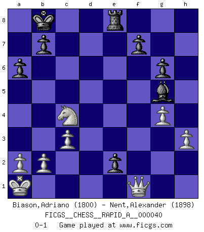 Last move : 0-1 2008 May 30 8:46:6 [Event "FICGS__CHESS__RAPID_A__000040"] [Site "FICGS"] [Date "2008.02.15"] [Round "1"] [White "Biason,Adriano"] [Black "Nent,Alexander"] [Result "0-1"] [WhiteElo "1800"] [BlackElo "1898"] 1.e4 c5 2.Nf3 d6 3.d4 cxd4 4.Nxd4 Nf6 5.Nc3 a6 6.Be3 e5 7.Nde2 Be6 8.f4 Nbd7 9.f5 Bc4 10.Nc1 Qc7 11.Nb3 d5 12.Nxd5 Bxd5 13.exd5 Nb6 14.Bxb6 Qxb6 15.Qe2 O-O-O 16.O-O-O Qc7 17.g3 Rxd5 18.Rxd5 Nxd5 19.Bg2 Nf6 20.Rd1 Kb8 21.g4 g5 22.fxg6 hxg6 23.h3 Bh6+ 24.Kb1 Bg5 25.c3 e4 26.Nd2 Re8 27.Nf1 Qf4 28.Nd2 e3 29.Nc4 Ne4 30.Bxe4 Qxe4+ 31.Ka1 Qf4 32.Rf1 Qxf1+ 33.Qxf1 e2 0-1 Sicilian : Najdorf, Byrne (English) attack Queenside Castling by player Black (move 15) Queenside Castling by player White (move 16) Player Black won this chess game. Follow this game move after move (download)The passed pawn is a criminal, who should be kept under lock and key. Mild measures, such as police surveillance, are not sufficient. (Nimzovitch) Die starken Figuren des Gegners muss man abtauschen. (José Raúl Capablanca) El Ajedrez es imaginación. (David Bronstein) La victoire dans une partie d'Echecs appartient la plupart du temps à celui qui voit un peu plus loin que l'adversaire. (Lasker) Fear is the path to the dark side. Fear leads to anger; anger leads to hate; hate leads to suffering. I sense much fear in you. (Master Yoda in Star Wars ep.1)
