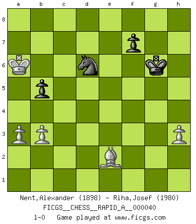 Last move : 1-0 2008 April 7 13:39:36 [Event "FICGS__CHESS__RAPID_A__000040"] [Site "FICGS"] [Date "2008.02.15"] [Round "1"] [White "Nent,Alexander"] [Black "Riha,Josef"] [Result "1-0"] [WhiteElo "1898"] [BlackElo "1980"] 1.d4 d5 2.c4 dxc4 3.Nf3 a6 4.e3 Bg4 5.Bxc4 e6 6.Nc3 Nf6 7.h3 Bh5 8.g4 Bg6 9.Ne5 Nbd7 10.Nxg6 hxg6 11.Bf1 c6 12.Bg2 Be7 13.O-O Qc7 14.f4 Nd5 15.e4 N5b6 16.Qe2 Qd6 17.Be3 Qb4 18.Rac1 Rd8 19.b3 Qa5 20.Rc2 Qb4 21.d5 cxd5 22.exd5 exd5 23.Rd1 O-O 24.Nxd5 Nxd5 25.Bxd5 Nf6 26.Rd4 Qb6 27.R4d2 Qb4 28.Bf3 Rfe8 29.Rxd8 Bxd8 30.Qd2 Qxd2 31.Rxd2 Ba5 32.Rd3 b5 33.a3 Rxe3 34.Rxe3 Bb6 35.Kf2 Ne8 36.Ke2 Bxe3 37.Kxe3 Nc7 38.f5 gxf5 39.gxf5 Kf8 40.Kd4 Ke7 41.Kc5 Ne8 42.Kb6 Nd6 43.Bg4 Kf6 44.Kxa6 g6 45.fxg6 Kxg6 46.Be2 1-0 QGA : Alekhine defense Kingside Castling by player White (move 13) Kingside Castling by player Black (move 23) 10 pieces endgame at move 45 : White KBPPPP , Black KNPP WHITE : King + 1 Bishop 4 Pawns BLACK : King + 1 Knight 2 Pawns 9 pieces endgame at move 45 : White KBPPP , Black KNPP WHITE : King + 1 Bishop 3 Pawns BLACK : King + 1 Knight 2 Pawns Player White won this chess game. Follow this game move after move (download)For surely of all the drugs in the world, Chess must be the most permanently pleasurable. (Assiac) Schon mancher Spieler hat aufgegeben, um zu vermeiden, daß er eine Figur verliert. (Savielly Grigorievitsch Tartakower) Sin errores no puede haber brillantez. (Emanuel Lasker) Les erreurs sont comme les malheurs, elles n'arrivent jamais seules. (Siegbert Tarrasch) The bottom line is always the bottom line. (Johann Piek)