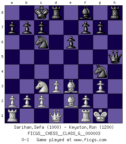 Last move : 0-1 2006 July 12 7:27:47 [Event "FICGS__CHESS__CLASS_G__000003"] [Site "FICGS"] [Date "2006.07.04"] [Round "1"] [White "Sarihan,Sefa"] [Black "Keyston,Ron"] [Result "0-1"] [WhiteElo "1000"] [BlackElo "1200"] 1.e4 d5 2.exd5 Qxd5 3.Nf3 Bg4 4.Be2 Nc6 5.O-O O-O-O 6.d3 Nf6 7.Nc3 Qf5 8.Be3 e6 9.h3 h5 10.hxg4 hxg4 11.Nh2 Qe5 12.Nxg4 Nxg4 13.g3 Qh5 0-1 Scandinavian (centre counter) defense Kingside Castling by player White (move 5) Queenside Castling by player Black (move 5) Player Black won this chess game. Follow this game move after move (download)Without error there can be no brilliancy. (Emanuel Lasker) Wenn es im Universum noch irgendwo intelligente Lebewesen gibt, dann kennen sie Go. (Emanuel Lasker) Jugadores de primera clase pierden en contra de jugadores de segunda clase porque los jugadores de segunda clase a veces juegan una partida de primer clase. (Siegbert Tarrasch) Il n'y a plus de joueurs du niveau de Jacob Murray dont la seule quête est le beau jeu, le plaisir de voir les pièces construire quelque chose. Sur 10 idées à la minute, 9 seront sans intérêt, la dernière s'avèrera géniale. (Christian Bauer) He who defends everything defends nothing. (Frederick the Great)