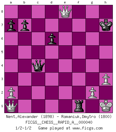 Last move : 1/2-1/2 2008 June 10 13:53:13 [Event "FICGS__CHESS__RAPID_A__000040"] [Site "FICGS"] [Date "2008.02.15"] [Round "1"] [White "Nent,Alexander"] [Black "Romaniuk,Dmytro"] [Result "1/2-1/2"] [WhiteElo "1898"] [BlackElo "1800"] 1.d4 Nf6 2.c4 g6 3.Nc3 d5 4.cxd5 Nxd5 5.e4 Nxc3 6.bxc3 Bg7 7.Bc4 O-O 8.Ne2 c5 9.Be3 Nc6 10.O-O cxd4 11.cxd4 Bg4 12.f3 Na5 13.Bd3 Be6 14.d5 Bxa1 15.Qxa1 f6 16.Bh6 Re8 17.Kh1 Rc8 18.Nf4 Bd7 19.e5 Nc4 20.e6 Ba4 21.Nxg6 hxg6 22.Bxg6 Ne5 23.Be4 Bc2 24.Bxc2 Rxc2 25.Qd1 Kh7 26.f4 Kxh6 27.fxe5 Qc8 28.exf6 Rf8 29.f7 Qc4 30.d6 exd6 31.Re1 Rf2 32.h3 Kg7 33.Qa1+ Kh7 34.e7 R8xf7 35.e8Q Rf1+ 36.Rxf1 Rxf1+ 1/2-1/2 King's Indian defense, 3.Nc3 Kingside Castling by player Black (move 7) Kingside Castling by player White (move 10) Promotion Queen by player White (move 35) This chess game ended in a draw. Follow this game move after move (download)Botvinnik tried to take the mystery out of Chess, always relating it to situations in ordinary life. He used to call Chess a typical inexact problem similar to those which people are always having to solve in everyday life. (Garry Kasparov) Ich könnte leicht behaupten: Ja,ja, Leonid Breschnew wollte nicht, daß ich Weltmeister werde. In der Tat war die Sache komplizierter. (Viktor Kortschnoi) Bobby solo arroja las piezas y solas caen en las casillas correctas. (Miguel Najdorf ) Avant la finale, les dieux ont créé le milieu de partie. (Tarrasch) You must do what you feel is right... of course. (Obi-Wan Kenobi in Star Wars ep.4)