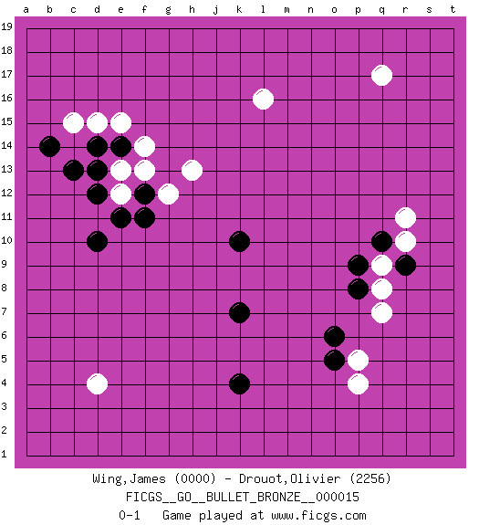 Last move : 0-1 2009 August 15 8:35:23 [Event "FICGS__GO__BULLET_BRONZE__000015"] [Site "FICGS"] [Date "2009.08.15"] [Round "1"] [Black "Wing,James"] [White "Drouot,Olivier"] [Result "0-1"] [Rating 1 "0000"] [Rating 2 "2256"] 1.k10 d4 2.d10 p4 3.k7 q17 4.k4 d15 5.d14 e15 6.e14 f14 7.d13 c15 8.c13 f13 9.f12 e12 10.e11 g12 11.f11 e13 12.d12 h13 13.b14 l16 14.o5 p5 15.o6 q7 16.p8 q8 17.p9 r10 18.r9 q9 19.q10 r11 0-1 This go game has been lost on time (started : 2009.08.15 1:50:3) Here are the names of the openings (joseki) played in the four corners : Corner d16 : d15 d14 Takamoku (Gomok, Gaomu`) 5-4 Point. The takamoku (high) point (5-4). With its emphasis on influence, the 5-4 point complements the 4-4 (hoshi) point in creating an influence-oriented fuseki. Corner q4 : p4 o5 Takamoku (Gomok, Gaomu`) 5-4 Point. The takamoku (high) point (5-4). With its emphasis on influence, the 5-4 point complements the 4-4 (hoshi) point in creating an influence-oriented fuseki. Player White won this Go (weiqi, baduk) game. Follow this game move after move (download)Don't disturb symmetry. (Anonymous) Perfection is achieved, not when there is nothing more to add, but when there is nothing left to take away. (Antoine de Saint-Exupéry)