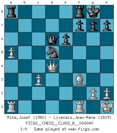 Last move : 1-0 2008 June 19 0:42:29 [Event "FICGS__CHESS__CLASS_B__000040"] [Site "FICGS"] [Date "2008.02.15"] [Round "1"] [White "Riha,Josef"] [Black "Livenais,Jean-Rene"] [Result "1-0"] [WhiteElo "1980"] [BlackElo "1819"] 1.e4 c5 2.Nf3 e6 3.d4 cxd4 4.Nxd4 Nc6 5.Nc3 Qc7 6.Be2 a6 7.O-O b5 8.Nxc6 Qxc6 9.Bf3 Bb7 10.Bf4 Rd8 11.e5 Qc7 12.a4 b4 13.Ne4 Bxe4 14.Bxe4 Ne7 15.Bg3 Ng6 16.f4 Bc5+ 17.Kh1 d6 18.exd6 Bxd6 19.Qe2 O-O 20.Qxa6 Nxf4 21.Qb7 Nh5 22.Bxd6 Qxd6 23.a5 Nf6 24.Bf3 Rb8 25.Qa7 Nd5 26.Qd4 Ra8 27.c4 bxc3 28.bxc3 1-0 This chess game has been lost on time (started : 2008.02.15 21:15:16) Sicilian : Taimanov (Bastrikov) variation Kingside Castling by player White (move 7) Kingside Castling by player Black (move 19) Player White won this chess game. Follow this game move after move (download)Chess is not like life... it has rules ! (Mark Pasternak) Ohne ihre Erfolge schmälern zu wollen würde ich sagen Petrosian, Spassky und Karpov verdanken ihre Siege ihren Trainern - Boleslavsky, Bondarevsky und Furman. (Mikhail Moiseyevich Botvinik) El ganador de una partida es aquel jugador que hace el penúltimo error. (Savielly Tartakover) Le système Elo représente seulement une moyenne. Il est simplement un indicateur de votre stabilité. (Anatoli Karpov) Better than a thousand days of diligent study is one day with a great teacher. (Japanese proverb)
