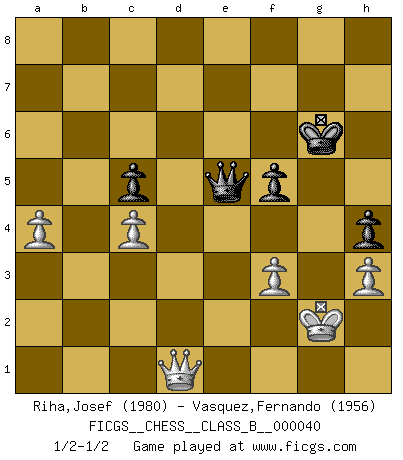 Last move : 1/2-1/2 2008 May 8 9:23:8 [Event "FICGS__CHESS__CLASS_B__000040"] [Site "FICGS"] [Date "2008.02.15"] [Round "1"] [White "Riha,Josef"] [Black "Vasquez,Fernando"] [Result "1/2-1/2"] [WhiteElo "1980"] [BlackElo "1956"] 1.e4 e5 2.Nf3 Nf6 3.d4 Nc6 4.d5 Na5 5.Nxe5 Bd6 6.f4 O-O 7.Bd3 Bc5 8.c3 d6 9.b4 dxe5 10.bxc5 c6 11.d6 Re8 12.O-O b6 13.Qf3 Nd7 14.Be3 exf4 15.Qxf4 f6 16.Be2 Nb7 17.cxb6 axb6 18.Nd2 Ndc5 19.Bh5 Re6 20.Bd1 Kh8 21.Bg4 Re8 22.Bh5 Re6 23.Rad1 Nd3 24.Qh4 Nxd6 25.Bg6 Qg8 26.Nc4 Nxc4 27.Rxd3 Bd7 28.Rxd7 Ne5 29.Bf7 Nxf7 30.Bxb6 Qe8 31.Ra7 Rxa7 32.Bxa7 Nd6 33.Rb1 Rxe4 34.Qg3 Nb5 35.Bf2 Kg8 36.Ra1 Rc4 37.Re1 Qd7 38.Re3 Kf7 39.h3 Qd6 40.Qf3 Qd5 41.Qg3 h6 42.Rd3 Qf5 43.Qe3 h5 44.Qd2 Rf4 45.Re3 Kg6 46.Qe2 Kh7 47.Bg3 Ra4 48.Be1 Nd6 49.Qd1 Nc4 50.Rf3 Qb5 51.Rf4 Kh6 52.Bd2 Kg6 53.Be3 Nb6 54.Rf3 Re4 55.Qc2 f5 56.Qd1 Kh7 57.Bd4 g6 58.Re3 Rxe3 59.Bxe3 Nd5 60.Bd4 c5 61.Be5 Qc4 62.Qb1 Kh6 63.Qc2 h4 64.Kf2 Nf4 65.Qd2 g5 66.Bxf4 gxf4 67.a3 Qe4 68.Qe2 Qb7 69.a4 Qc7 70.Qd2 Kg5 71.c4 Kg6 72.Kf1 f3 73.gxf3 Qc6 74.Qd1 Qa6 75.Qb3 Qf6 76.Qc2 Qa1+ 77.Kg2 Qg7 78.Qd1 Qe5 1/2-1/2 Petrov : Modern (Steinitz) attack Kingside Castling by player Black (move 6) Kingside Castling by player White (move 12) This chess game ended in a draw. Follow this game move after move (download)I believe that Chess possesses a magic that is also a help in advanced age. A rheumatic knee is forgotten during a game of Chess and other events can seem quite unimportant in comparison with a catastrophe on the chessboard. (Vlastimil Hort) Frage: Was machen Sie mit den Preisen? Anwort: Ich habe Angst, dass meine Freundin davon neue Kleider kauft. (Loek van Wely) El Ajedrez es despiadado: debes de estar preparado para matar gente. (Nigel Short) 'L'échange des dames est un coup dur pour les deux adversaires...' Un journaliste lors d'une partie du match Spassky-Fischer I fear not the man who has practiced 10,000 kicks once, but I fear the man who has practiced one kick 10,000 times. (Bruce Lee)