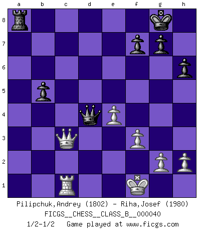 Last move : 1/2-1/2 2008 April 7 21:12:3 [Event "FICGS__CHESS__CLASS_B__000040"] [Site "FICGS"] [Date "2008.02.15"] [Round "1"] [White "Pilipchuk,Andrey"] [Black "Riha,Josef"] [Result "1/2-1/2"] [WhiteElo "1802"] [BlackElo "1980"] 1.d4 Nf6 2.c4 e6 3.Nc3 Bb4 4.Qc2 O-O 5.a3 Bxc3+ 6.Qxc3 b6 7.Bg5 Bb7 8.f3 h6 9.Bh4 d5 10.cxd5 exd5 11.e3 Re8 12.Bf2 c5 13.Bb5 cxd4 14.Qxd4 Bc6 15.Bd3 Nbd7 16.b4 Ne5 17.Ne2 Qd7 18.O-O Nxd3 19.Qxd3 Bb5 20.Qd2 d4 21.e4 Bxe2 22.Qxe2 Nd5 23.Rac1 Nc3 24.Qd3 Red8 25.Bh4 Rdc8 26.Rc2 a5 27.Rfc1 axb4 28.axb4 Qd6 29.Bf2 Qxb4 30.Bxd4 Ne2+ 31.Qxe2 Qxd4+ 32.Kf1 Rxc2 33.Qxc2 b5 34.Qc3 1/2-1/2 Nimzo-Indian : Classical variation Kingside Castling by player Black (move 4) Kingside Castling by player White (move 18) This chess game ended in a draw. Follow this game move after move (download)There are two classes of men; those who are content to yield to circumstances and who play whist; those who aim to control circumstances, and who play Chess. (Mortimer Collins) Im Hotelzimmer gab es nur zwei Schaben. (Über die Turnierbedingungen) (Peter Swidler) La señal de un Gran Maestro es su habilidad de ganar una partida rápidamente y sin dolor. (Irving Chernev) Ce n'est pas pour s'amuser qu'il joue aux échecs : il célèbre un culte. (Vladimir Nabokov) If you ain't just a little scared when you enter a casino, you are either very rich or you haven't studied the games enough. (Pappy)