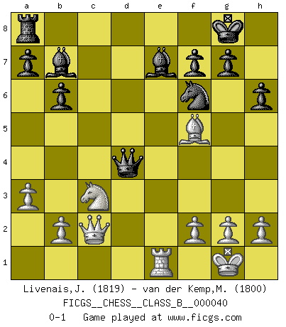Last move : 0-1 2008 July 24 4:2:26 [Event "FICGS__CHESS__CLASS_B__000040"] [Site "FICGS"] [Date "2008.02.15"] [Round "1"] [White "Livenais,Jean-Rene"] [Black "van der Kemp,Michel"] [Result "0-1"] [WhiteElo "1819"] [BlackElo "1800"] 1.e4 c5 2.c3 d5 3.exd5 Qxd5 4.d4 e6 5.Nf3 Nf6 6.Be3 cxd4 7.cxd4 Nc6 8.Nc3 Qd6 9.a3 Be7 10.Bd3 O-O 11.O-O b6 12.Qe2 Bb7 13.Rad1 Rfd8 14.Rfe1 Rac8 15.Bb1 h6 16.d5 exd5 17.Bf5 Ra8 18.Qd2 d4 19.Qc2 Qc5 20.Nxd4 Nxd4 21.Bxd4 Rxd4 22.Rxd4 Qxd4 0-1 This chess game has been lost on time (started : 2008.02.15 21:15:16) Sicilian : Alapin's variation (2.c3) Kingside Castling by player Black (move 10) Kingside Castling by player White (move 11) Player Black won this chess game. Follow this game move after move (download)Fischer was a master of clarity and a king of artful positioning. His opponents would see where he was going but were powerless to stop him. (Bruce Pandolfini) Frage des Reporters: -Worin besteht das Ziel von Gambiteröffnungen? Antwort: -Auf Kosten der Partie einen Ruf als Angriffspieler zu erwerben.- (Siegbert Tarrasch) Hay jugadores fuertes y personas amables y yo soy un jugador fuerte. (Bobby Fischer) Le succès, c'est être capable d'aller d'échec en échec sans perdre son enthousiasme. (Winston Churchill) Art is the triumph over chaos. (John Cheever)