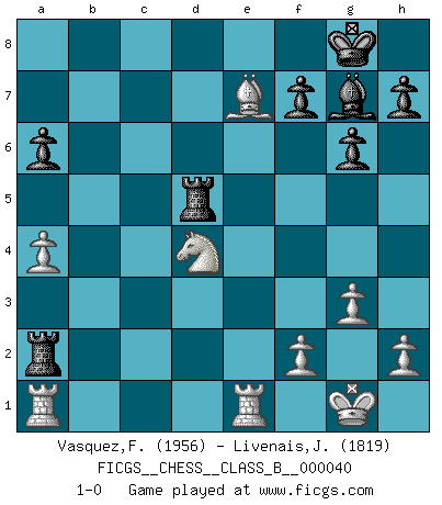 Last move : 1-0 2008 July 3 2:11:22 [Event "FICGS__CHESS__CLASS_B__000040"] [Site "FICGS"] [Date "2008.02.15"] [Round "1"] [White "Vasquez,Fernando"] [Black "Livenais,Jean-Rene"] [Result "1-0"] [WhiteElo "1956"] [BlackElo "1819"] 1.e4 c5 2.d4 cxd4 3.c3 g6 4.cxd4 d5 5.exd5 Nf6 6.Bb5+ Nbd7 7.Nf3 a6 8.Bd3 Nb6 9.Nc3 Bg7 10.O-O O-O 11.a4 Nbxd5 12.Qb3 Qd6 13.Re1 Be6 14.Bc4 Nc7 15.Bg5 Bxc4 16.Qxc4 Rfd8 17.Qb3 Ne6 18.Rad1 Rac8 19.Bh4 Nd5 20.Qxb7 Rb8 21.Qxd5 Qxd5 22.Nxd5 Rxd5 23.Bxe7 Rxb2 24.g3 Ra2 25.Ra1 Nxd4 26.Nxd4 1-0 This chess game has been lost on time (started : 2008.02.15 21:15:16) Sicilian : Smith-Morra gambit Kingside Castling by player White (move 10) Kingside Castling by player Black (move 10) Player White won this chess game. Follow this game move after move (download)To avoid losing a piece, many a person has lost the game. (Savielly Tartakover) Wer wird heute Abend ihr Gegner sein? -- Heute Abend spiele ich gegen die schwarzen Steine. (Akiba Rubinstein) El Ajedrez se juega con la mente... ¡no con las manos!. (Renaud y Kahn) Des combinaisons [dans le jeu d'échecs] pareilles à des mélodies. Je crois entendre pour ainsi dire la musique des coups... (Vladimir Nabokov) There is a very easy way to return from a casino with a small fortune : go there with a large one. (Jack Yelton)