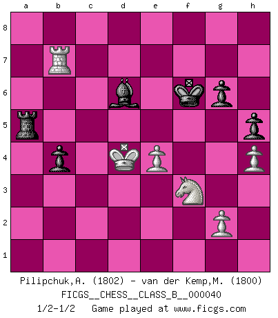 Last move : 1/2-1/2 2008 July 31 21:45:28 [Event "FICGS__CHESS__CLASS_B__000040"] [Site "FICGS"] [Date "2008.02.15"] [Round "1"] [White "Pilipchuk,Andrey"] [Black "van der Kemp,Michel"] [Result "1/2-1/2"] [WhiteElo "1802"] [BlackElo "1800"] 1.d4 Nf6 2.c4 g6 3.Nc3 d5 4.cxd5 Nxd5 5.e4 Nxc3 6.bxc3 Bg7 7.Nf3 c5 8.Be3 Qa5 9.Qd2 O-O 10.Rb1 b6 11.Rb5 Qa4 12.Rb3 cxd4 13.cxd4 Ba6 14.Rb4 Qd7 15.Bd3 e5 16.d5 f5 17.Qc3 Rc8 18.Qb3 Bxd3 19.Qxd3 fxe4 20.Rxe4 Rd8 21.Nxe5 Qxd5 22.Qxd5+ Rxd5 23.Nf3 Nd7 24.Ke2 Nf6 25.Rc4 Re8 26.Rhc1 Ra5 27.a4 Nd5 28.Kd3 Nxe3 29.fxe3 a6 30.Rc8 Rf8 31.R1c4 b5 32.axb5 axb5 33.Rxf8+ Bxf8 34.Rc8 Kg7 35.Rb8 b4 36.Rb7+ Kf6 37.h4 h5 38.e4 Bd6 39.Kd4 1/2-1/2 King's Indian defense, 3.Nc3 Kingside Castling by player Black (move 9) This chess game ended in a draw. Follow this game move after move (download)It is not enough to be a good player... you must also play well. (Siegbert Tarrasch) Kritik überlasse ich den Spießern. Ich zeige nichts, wofür ich mich schämen muss. (Alexandra Kosteniuk) El pensamiento metódico es mas útil en el Ajedrez que la inspiración. (C. J. S. Purdy) Aux échecs, les retours au sommet sont rares : les dommages psychologiques consécutifs à une défaite sont trop sévères. (Daily Telegraph) As the days dwindle down... to a precious few. (Maxwell Anderson)