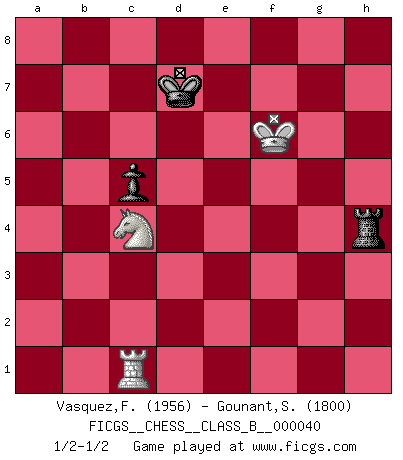 Last move : 1/2-1/2 2008 June 20 18:58:0 [Event "FICGS__CHESS__CLASS_B__000040"] [Site "FICGS"] [Date "2008.02.15"] [Round "1"] [White "Vasquez,Fernando"] [Black "Gounant,Stanislas"] [Result "1/2-1/2"] [WhiteElo "1956"] [BlackElo "1800"] 1.e4 e5 2.Nf3 Nc6 3.d4 exd4 4.Nxd4 Bc5 5.Nxc6 bxc6 6.Nc3 Nf6 7.Bd3 d6 8.Na4 Bb6 9.O-O h6 10.b3 O-O 11.Bb2 Re8 12.Qf3 Nd7 13.Bc4 Qe7 14.Rad1 Nf6 15.Qg3 Nh5 16.Qg6 Nf6 17.e5 dxe5 18.Ba3 Bf5 19.Bxf7+ Qxf7 20.Qxf5 e4 21.Bc5 Nd5 22.Qxf7+ Kxf7 23.c4 Nf6 24.Rfe1 Rab8 25.h3 g5 26.Bd4 Bxd4 27.Rxd4 Re5 28.Nc3 Rbe8 29.Nd1 a5 30.Kf1 h5 31.Ke2 Rg8 32.Rh1 a4 33.bxa4 Ra5 34.Nb2 Rb8 35.Rd2 e3 36.Rc2 exf2 37.Kxf2 Ne4+ 38.Kf3 Re8 39.g4 Nf6 40.Re2 hxg4+ 41.hxg4 Rxe2 42.Kxe2 Nxg4 43.Rh7+ Ke6 44.Rxc7 Ne5 45.Rc8 Ra7 46.Rh8 Nxc4 47.Nxc4 Rxa4 48.Kd3 Rxa2 49.Ke4 c5 50.Rh6+ Ke7 51.Ke5 g4 52.Re6+ Kd7 53.Rg6 g3 54.Rxg3 Ra1 55.Rg6 Re1+ 56.Kf4 Re6 57.Rg1 Rh6 58.Kg5 Rh3 59.Kf6 Rh4 60.Rc1 1/2-1/2 Scotch game Kingside Castling by player White (move 9) Kingside Castling by player Black (move 10) 10 pieces endgame at move 46 : White KRNPP , Black KRNPP WHITE : King + 1 Rook 1 Knight 2 Pawns BLACK : King + 1 Rook 1 Knight 2 Pawns 9 pieces endgame at move 47 : White KRNPP , Black KRPP WHITE : King + 1 Rook 1 Knight 2 Pawns BLACK : King + 1 Rook 2 Pawns 8 pieces endgame at move 47 : White KRNP , Black KRPP WHITE : King + 1 Rook 1 Knight 1 Pawn BLACK : King + 1 Rook 2 Pawns 7 pieces endgame at move 48 : White KRN , Black KRPP WHITE : King + 1 Rook 1 Knight BLACK : King + 1 Rook 2 Pawns 6 pieces endgame at move 54 : White KRN , Black KRP WHITE : King + 1 Rook 1 Knight BLACK : King + 1 Rook 1 Pawn This chess game ended in a draw. Follow this game move after move (download)Play the opening like a book, the middle game like a magician, and the endgame like a machine. (Spielmann) Schach ist ein schwarz-weisser Dschungel. (Garry Kasparov) ¿Cual es el objetivo de jugar una apertura de gambito?... Para adquirir una reputación de ser un jugador apuesto a costo de perder el juego. (Siegbert Tarrasch) Il a essayé de se convaincre qu'il pourrait empêcher toutes les erreurs et ne jamais perdre. L'horreur ! Gary Kasparov au sujet de Robert Fischer. Wikichess, chess moves explained by 'experimented' players. (Thibault de Vassal)
