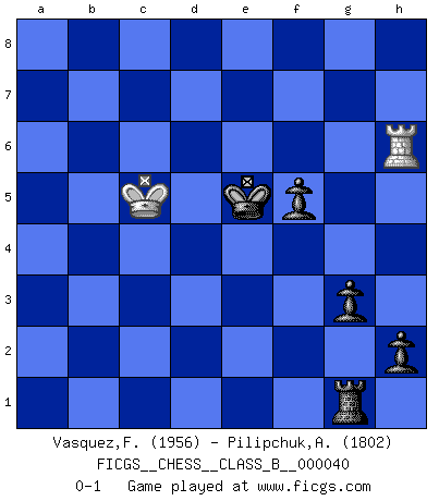 Last move : 0-1 2008 July 12 21:16:41 [Event "FICGS__CHESS__CLASS_B__000040"] [Site "FICGS"] [Date "2008.02.15"] [Round "1"] [White "Vasquez,Fernando"] [Black "Pilipchuk,Andrey"] [Result "0-1"] [WhiteElo "1956"] [BlackElo "1802"] 1.e4 e5 2.Nf3 Nc6 3.d4 exd4 4.Nxd4 Nf6 5.Nxc6 bxc6 6.Bd3 d5 7.exd5 cxd5 8.O-O Be7 9.Nc3 O-O 10.Bf4 Rb8 11.Rb1 Bd6 12.Qd2 c6 13.Rfe1 Be6 14.a3 a5 15.Na4 c5 16.c4 d4 17.h3 Ra8 18.Bxd6 Qxd6 19.Nc3 a4 20.Nb5 Qb6 21.Re5 h6 22.Rbe1 Rfe8 23.Qd1 Bd7 24.Rxe8+ Bxe8 25.Re7 Kf8 26.Re5 Bd7 27.Qf3 Rc8 28.Qe2 Qb8 29.Bc2 Be6 30.f4 Rd8 31.Qf1 Nd7 32.Re1 Nb6 33.Bd3 Bd7 34.Re5 Bxb5 35.cxb5 Qd6 36.Qf2 f6 37.Re1 Nd5 38.f5 Ne3 39.Bc2 Qb6 40.Bxa4 c4 41.Qd2 Rd5 42.Qb4+ Kg8 43.Kh1 Kh7 44.Qd2 Re5 45.Rc1 Kh8 46.Re1 Rxf5 47.Kg1 Qa7 48.Kh1 Nf1 49.b6 Qxb6 50.Qb4 Qc7 51.Re8+ Kh7 52.Qb8 Qxb8 53.Rxb8 Ne3 54.Kh2 Ra5 55.Bc6 d3 56.Bf3 d2 57.Rd8 Rb5 58.Kg3 Nf5+ 59.Kf2 Rxb2 60.Bd1 c3 61.Ke2 Rb1 62.Rd3 Rc1 63.a4 Ne7 64.h4 Nc6 65.h5 Na5 66.Rd4 f5 67.g3 Kg8 68.Rd7 Nc4 69.a5 Nxa5 70.Rc7 Kh7 71.Ba4 Re1+ 72.Kd3 d1Q+ 73.Bxd1 Rxd1+ 74.Kc2 Rh1 75.Kd3 Rxh5 76.Kxc3 Rh3 77.Kb4 Rxg3 78.Kxa5 h5 79.Rc4 g5 80.Rc7+ Kg6 81.Rc6+ Kf7 82.Kb4 h4 83.Ra6 h3 84.Ra7+ Kf6 85.Kc5 h2 86.Rh7 Rg2 87.Rh8 g4 88.Rh4 g3 89.Rh8 Rg1 90.Rh6+ Ke5 0-1 Scotch : Schmidt variation Kingside Castling by player White (move 8) Kingside Castling by player Black (move 9) Promotion Queen by player Black (move 72) 10 pieces endgame at move 75 : White KRP , Black KRNPPPP WHITE : King + 1 Rook 1 Pawn BLACK : King + 1 Rook 1 Knight 4 Pawns 9 pieces endgame at move 76 : White KRP , Black KRNPPP WHITE : King + 1 Rook 1 Pawn BLACK : King + 1 Rook 1 Knight 3 Pawns 8 pieces endgame at move 77 : White KR , Black KRNPPP WHITE : King + 1 Rook BLACK : King + 1 Rook 1 Knight 3 Pawns 7 pieces endgame at move 78 : White KR , Black KRPPP WHITE : King + 1 Rook BLACK : King + 1 Rook 3 Pawns Player Black won this chess game. Follow this game move after move (download)I'm not afraid of Spassky. The world knows I'm the best. You don't need a match to prove it. (Bobby Fischer) Ich weiss nicht was Gott gegen mich auf 1.e4 antworten würde. (Robert James Fischer) Puntos débiles o agujeros en la posición de tu oponente deben de ser ocupados por piezas, no Peones. (Siegbert Tarrasch) Les réformistes prétendent que les progrès de la théorie conduiront à la disparition des échecs, et qu'il faut, pour leur rendre vie, en remanier les règles. En réalité, qu'exprime cette affirmation? Le mépris de l'intuition, de l'imagination et de tous les autres éléments qui font des échecs un art. (Alexander Alekhine) Looking at the proliferation of personal web pages on the Net, it looks like very soon everyone on Earth will have 15 megabytes of fame. (M.G. Sriram)
