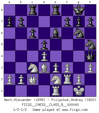 Last move : 1/2-1/2 2008 March 31 21:28:44 [Event "FICGS__CHESS__CLASS_B__000040"] [Site "FICGS"] [Date "2008.02.15"] [Round "1"] [White "Nent,Alexander"] [Black "Pilipchuk,Andrey"] [Result "1/2-1/2"] [WhiteElo "1898"] [BlackElo "1802"] 1.d4 d5 2.c4 e6 3.Nc3 Nf6 4.cxd5 exd5 5.Bg5 Be7 6.e3 O-O 7.Bd3 Nbd7 8.Nge2 Re8 9.O-O c6 10.Qc2 Nf8 11.f3 Be6 12.Rae1 Rc8 13.Kh1 Ng6 14.h3 Nh5 15.Bxe7 Qxe7 16.Rf2 Qh4 17.Kg1 1/2-1/2 QGD : Exchange, positional line Kingside Castling by player Black (move 6) Kingside Castling by player White (move 9) This chess game ended in a draw. Follow this game move after move (download)Only sissies Castle. (Rob Sillars) Obendrein hat der FIDE-Präsident den Revolutionsführer Gaddafi zum »Großmeister« ernannt, am Ende der WM. Das ist lächerlich! (Joel Lautier) Todos los Maestros de Ajedrez fueron un día unos principiantes. (Chernev) Un footballeur joue avec ses pieds, parfois avec sa tête. Un joueur d'échecs ne joue qu'avec sa tête. Et quand il ne joue plus, il meurt. (Jacob Murray) There is no instance of a country having benefited from prolonged warfare. (Sun Tzu)