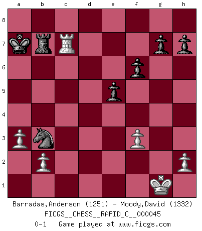 Last move : 0-1 2008 March 5 22:38:18 [Event "FICGS__CHESS__RAPID_C__000045"] [Site "FICGS"] [Date "2008.02.16"] [Round "1"] [White "Barradas,Anderson"] [Black "Moody,David"] [Result "0-1"] [WhiteElo "1251"] [BlackElo "1332"] 1.e4 e5 2.Nf3 Nc6 3.Bc4 Nf6 4.O-O Nxe4 5.Re1 d5 6.d3 dxc4 7.dxe4 Bg4 8.Nbd2 Bc5 9.Nxc4 Qxd1 10.Rxd1 f6 11.a3 Nd4 12.Rd3 Bxf3 13.gxf3 Nxc2 14.Rb1 Ne1 15.Rb3 O-O-O 16.Bd2 Nd3 17.Na5 Nxf2 18.Nxb7 Nxe4 19.Be3 Nd2 20.Nxd8 Rxd8 21.Bxc5 Nxb3 22.Bxa7 c5 23.Re1 Kb7 24.Re3 c4 25.Re4 Kxa7 26.Rxc4 Rb8 27.Rc7+ Rb7 0-1 Two knights defense Kingside Castling by player White (move 4) Queenside Castling by player Black (move 15) Player Black won this chess game. Follow this game move after move (download)Chess is life. (Bobby Fischer) Ein bischen Romantik kann weder im Schach noch in der Liebe schaden. Also versuche ich mich ab und zu daran zu erinnern. (Nigel Short) ¿Que sería del Ajedrez sin errores graciosos?. (Kurt Richter) Fischer est le meilleur joueur du monde et Karpov n'est qu'un joueur de bistrot. (Garry Kasparov, agé de 16 ans) Are you threatening me, Master Jedi ? (Chancellor Palpatine in Star Wars ep.3)