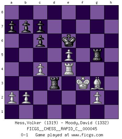 Last move : 0-1 2008 February 24 18:17:14 [Event "FICGS__CHESS__RAPID_C__000045"] [Site "FICGS"] [Date "2008.02.16"] [Round "1"] [White "Hess,Volker"] [Black "Moody,David"] [Result "0-1"] [WhiteElo "1319"] [BlackElo "1332"] 1.e4 e5 2.Nf3 Nc6 3.Bb5 f5 4.Bxc6 dxc6 5.exf5 e4 6.Ne5 Nf6 7.O-O Bd6 8.d4 O-O 9.Bg5 Bxf5 10.Nc3 Bxe5 11.dxe5 Qxd1 12.Raxd1 Ng4 13.f4 Ne3 14.Rd4 Nxf1 15.Kxf1 Rae8 16.Ke2 h6 17.Bh4 g5 18.fxg5 hxg5 19.Bg3 Kf7 20.Nxe4 Bxe4 21.Rxe4 Ke6 22.c4 Rd8 23.h4 Rg8 24.hxg5 Rxg5 25.Kf2 Rd2+ 26.Kf3 Rd3+ 0-1 Ruy Lopez : Schliemann defense Kingside Castling by player White (move 7) Kingside Castling by player Black (move 8) Player Black won this chess game. Follow this game move after move (download)All I want to do, ever, is just play Chess. (Bobby Fischer) Wenn Capablanka heute auf der Schachbühne erscheinen würde, hätte er ein halbes Jahr gebraucht um sich die Schachtheorie anzueignen. Und dann hätte er alles und jeden besiegt. (Mikhail Moiseyevich Botvinik) Yo he agregado estos principios a la ley: pongan los Caballos en acción antes de que los dos Alfiles sean desarrollados. (Emanuel Lasker) Aidez vos pièces, elles vous aideront. (Paul Morphy) A good programmer is someone who always looks both ways before crossing a one-way street. (Doug Linder)