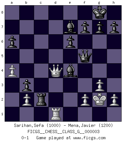 Last move : 0-1 2006 September 16 9:8:14 [Event "FICGS__CHESS__CLASS_G__000003"] [Site "FICGS"] [Date "2006.07.04"] [Round "1"] [White "Sarihan,Sefa"] [Black "Mena,Javier"] [Result "0-1"] [WhiteElo "1000"] [BlackElo "1200"] 1.e4 c5 2.Nf3 d6 3.c3 Nf6 4.Bd3 Nc6 5.O-O e6 6.Na3 Be7 7.Re1 O-O 8.Nc2 Qc7 9.Ne3 b6 10.Bc2 Bb7 11.d3 Rfd8 12.g3 Rac8 13.a3 d5 14.Qe2 dxe4 15.dxe4 a6 16.Ng2 b5 17.a4 b4 18.Bd3 Qa5 19.Bd2 Nd7 20.Ne3 Nce5 21.Nxe5 Nxe5 22.Bc2 Rxd2 23.cxb4 cxb4 24.Qf1 Nf3+ 25.Kg2 Nxe1+ 26.Rxe1 Rdxc2 27.Nxc2 Rxc2 28.Qd3 b3 29.Rd1 Qf5 30.Qd4 Bxe4+ 0-1 Sicilian Kingside Castling by player White (move 5) Kingside Castling by player Black (move 7) Player Black won this chess game. Follow this game move after move (download)Man is a frivolous, a specious creature, and like a Chess player, cares more for the process of attaining his goal than for the goal itself. (Dostoyevsky) Es ist schade, dass viele Schachsportler vergessen, wie wichtig Auftreten und angemessene Kleidung sind. (Alexandra Kosteniuk) El Ajedrez es tan inspirador que yo no creo que un buen jugador sea capaz de tener un pensamiento malo durante una partida. (Wilhelm Steinitz) Le joueur d'Echecs qui veut atteindre le top est obligé de développer son propre credo créatif. Alexeï Stepanovicth Souétine. Il est facile d'écrire des livres ! Ce qui est difficile, c'est de jouer ! (Alexeï Stepanovicth Souétine) Watch your thoughts; they become words. Watch your words; they become actions. Watch your actions; they become habits. Watch your habits; they become character. Watch your character; it becomes your destiny. (Frank Outlaw)