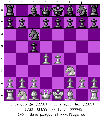 Last move : 1-0 2008 March 22 16:49:32 [Event "FICGS__CHESS__RAPID_C__000045"] [Site "FICGS"] [Date "2008.02.16"] [Round "1"] [White "Orden,Jorge"] [Black "Lorena,JC Mei"] [Result "1-0"] [WhiteElo "1258"] [BlackElo "1263"] 1.e4 c5 2.Nf3 Nc6 3.d4 1-0 This chess game has been lost on time (started : 2008.02.16 14:55:3) Sicilian defense Player White won this chess game. Follow this game move after move (download)The Pawns are the soul of the game. (Francois Andre Danican Philidor) Über Frauen: Chess is better. (Robert James Fischer) Repentinamente, me resultaba obvio en mi analisis que yo había pasado por alto lo que Fischer había visto en el tablero con la mas grande facilidad. (Mikhail Botvinnik) Un footballeur joue avec ses pieds, parfois avec sa tête. Un joueur d'échecs ne joue qu'avec sa tête. Et quand il ne joue plus, il meurt. (Jacob Murray) Only sick music makes money today. (Friedrich Nietzsche)