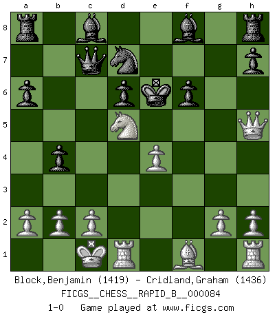 Last move : 1-0 2008 March 7 3:10:36 [Event "FICGS__CHESS__RAPID_B__000084"] [Site "FICGS"] [Date "2008.02.16"] [Round "1"] [White "Block,Benjamin"] [Black "Cridland,Graham"] [Result "1-0"] [WhiteElo "1419"] [BlackElo "1436"] 1.e4 c5 2.Nf3 d6 3.d4 cxd4 4.Nxd4 Nf6 5.Nc3 a6 6.Bg5 e6 7.f4 Qb6 8.Nb3 Qc7 9.Bxf6 gxf6 10.Qh5 Nd7 11.O-O-O b5 12.f5 Ke7 13.Nd4 b4 14.fxe6 fxe6 15.Nxe6 Kxe6 16.Nd5 1-0 Sicilian : Najdorf, 7...Qb6 Queenside Castling by player White (move 11) Player White won this chess game. Follow this game move after move (download)The most powerful weapon in Chess is to have the next move. (David Bronstein) In Buenos Aires ist es nicht mein vorrangiges Ziel ein starkes Turnier zu organisieren, sondern ein Turnier für Gentlemen. Ich würde nie Kamsky einladen. Ich mag keine Probleme. (Miguel Najdorf) Nada excita más a Grandes Maestros aburridos que una novedad teórica. (Dominic Lawson) Le succès, c'est être capable d'aller d'échec en échec sans perdre son enthousiasme. (Winston Churchill) Tomorrow's what you make of it. (Horatio Caine, C.S.I. Miami)