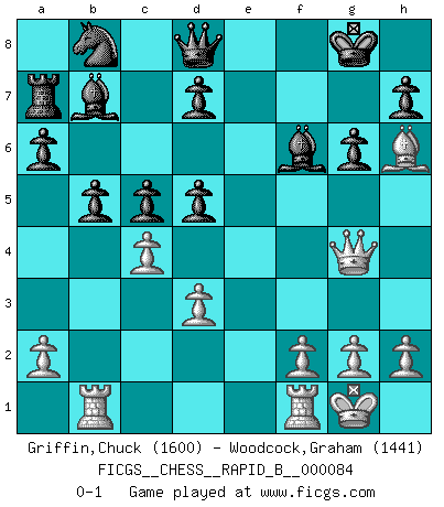 Last move : 0-1 2008 May 16 22:6:16 [Event "FICGS__CHESS__RAPID_B__000084"] [Site "FICGS"] [Date "2008.02.16"] [Round "1"] [White "Griffin,Chuck"] [Black "Woodcock,Graham"] [Result "0-1"] [WhiteElo "1600"] [BlackElo "1441"] 1.e4 c5 2.Nc3 g6 3.Bc4 Bg7 4.Nf3 Nf6 5.d3 O-O 6.O-O a6 7.Ng5 b5 8.Bxf7+ Rxf7 9.Nxf7 Kxf7 10.Qf3 Kg8 11.Bg5 Bb7 12.Nd5 Nxd5 13.exd5 Bxb2 14.Rab1 Bf6 15.Bh6 e6 16.c4 Ra7 17.Qg4 exd5 0-1 This chess game has been lost on time (started : 2008.02.16 17:58:14) Sicilian : Closed Kingside Castling by player Black (move 5) Kingside Castling by player White (move 6) Player Black won this chess game. Follow this game move after move (download)Blessed be the memory of him who gave the world this immortal game. (A. G. Gardiner) Smyslow ist ein Beweis dafür, dass ich noch zehn Jahre spielen kann! [der 75 jährige über den 85 jährigen] (Viktor Kortschnoi) Fischer sacrificó virtualmente todo lo que la mayoría de nosotros los 'debiles' (término que él usa) valoramos, respetamos y apreciamos por el amor de un astuto, a menudo hermoso tablero de juego, por el privilegio ambivalente de ser su mas grande maestro. (Paul Kollar) Fischer est le meilleur joueur du monde et Karpov n'est qu'un joueur de bistrot. (Garry Kasparov, agé de 16 ans) There will be no order, only chaos. (Sol Robeson in Pi by Darren Aronofsky)