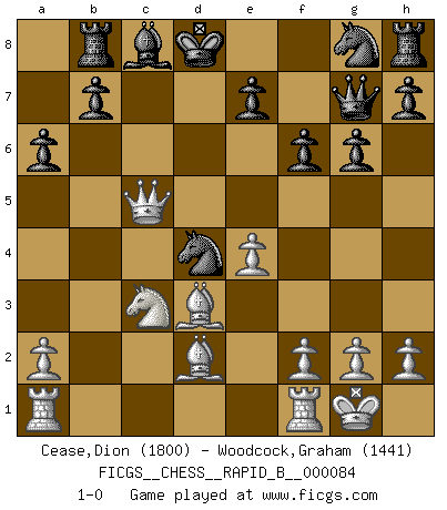 Last move : 1-0 2008 May 25 10:43:8 [Event "FICGS__CHESS__RAPID_B__000084"] [Site "FICGS"] [Date "2008.02.16"] [Round "1"] [White "Cease,Dion"] [Black "Woodcock,Graham"] [Result "1-0"] [WhiteElo "1800"] [BlackElo "1441"] 1.e4 c5 2.Nf3 g6 3.d4 Bg7 4.c4 Qb6 5.dxc5 Qxc5 6.Be2 Qb4+ 7.Nc3 Bxc3+ 8.bxc3 Qxc3+ 9.Bd2 Qg7 10.Qc1 f6 11.Nd4 Nc6 12.Nb5 Kd8 13.O-O a6 14.Qa3 Rb8 15.Nc3 Nd4 16.Bd3 d6 17.c5 dxc5 18.Qxc5 1-0 This chess game has been lost on time (started : 2008.02.16 17:58:14) Sicilian : Hungarian variation Kingside Castling by player White (move 13) Player White won this chess game. Follow this game move after move (download)Fischer wanted to give the Russians a taste of their own medicine. (Larry Evans) Ich kenne Menschen, die allen Willen der Welt besitzen und doch nicht Schach spielen können. (Robert James Fischer) ¿Esta Bobby Fischer algo cuerdo?. (Salo Flohr) Karpov est une pièce de musée. (Garry Kasparov) The greatest con, that he ever pulled... was making you believe... that he is you. (Revolver, movie)