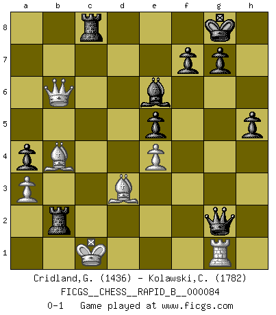 Last move : 0-1 2008 April 1 23:10:13 [Event "FICGS__CHESS__RAPID_B__000084"] [Site "FICGS"] [Date "2008.02.16"] [Round "1"] [White "Cridland,Graham"] [Black "Kolawski,Christof"] [Result "0-1"] [WhiteElo "1436"] [BlackElo "1782"] 1.e4 c5 2.Nf3 Nc6 3.d4 cxd4 4.Nxd4 Qb6 5.Nb3 Nf6 6.Nc3 e6 7.Be3 Qc7 8.f3 Bb4 9.Qd2 d5 10.a3 Bxc3 11.Qxc3 dxe4 12.fxe4 O-O 13.Bd3 Ng4 14.Bd2 a5 15.O-O-O Nf2 16.Kb1 Nxd1 17.Rxd1 Qxh2 18.Nd4 Nxd4 19.Qxd4 e5 20.Qb6 Bg4 21.Re1 a4 22.Qxb7 Qxg2 23.Bb4 Rfc8 24.Rf1 Be6 25.Qb5 h5 26.Qb6 Rxc2 27.Rg1 Rxb2+ 28.Kc1 Rc8+ 0-1 Sicilian defense Kingside Castling by player Black (move 12) Queenside Castling by player White (move 15) Player Black won this chess game. Follow this game move after move (download)In Chess, at least, the brave inherit the earth. (Edmar Mednis) Woher wissen wir, daß der Neanderthaler Blindschach gespielt hat? -- Bei Ausgrabungen wurden keine Schachbretter und Figuren gefunden. (Anonymous) No es una movida, aún la mejor movida que tu debas buscar, sino un plan comprensible. (Eugene Znosko-Borovsky) Les Echecs représentent une sphère d'idées créatrices basée sur la volonté des deux protagonistes. (Smyslov) History is a gallery of pictures in which there are few originals and many copies. (Alexis de Tocqueville)