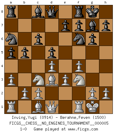 Last move : 1-0 2008 April 3 6:52:25 [Event "FICGS__CHESS__NO_ENGINES_TOURNAMENT__000005"] [Site "FICGS"] [Date "2008.02.16"] [Round "1"] [White "Inving,Yugi"] [Black "Berahne,Feven"] [Result "1-0"] [WhiteElo "0914"] [BlackElo "1500"] 1.f4 d5 2.Nf3 Nf6 3.e3 g6 4.Bb5+ c6 5.Be2 Bg7 6.Nc3 O-O 7.d4 b5 8.O-O a5 9.Bd3 Na6 10.a3 1-0 This chess game has been lost on time (started : 2008.02.16 20:25:17) Bird's Opening Kingside Castling by player Black (move 6) Kingside Castling by player White (move 8) Player White won this chess game. Follow this game move after move (download)When I asked Fischer why he had not played a certain move in our game, he replied: 'Well, you laughed when I wrote it down !' (Mikhail Tal) Korrekt heißt in Deutschland die Haltung eines Mannes, dessen Benehmen nach dem Urteile seiner Nachbarn seiner Stellung angemessen ist. Um korrekt zu sein, muß man sich der Meinung der anderen anpassen... (Emanuel Lasker) Fischer deseaba darle a los Rusos una sopa de su propia medicina. (Larry Evans) Nous sommes les pions de la mystérieuse partie d'Echecs jouée par Dieu. Il nous déplace, nous arrête, nous pousse encore, puis nous lance un à un dans la boîte du Néant. Epitaphe sur la tombe de David Janowsky (1868-1927). Computers have lots of memory but no imagination. (Anonymous)