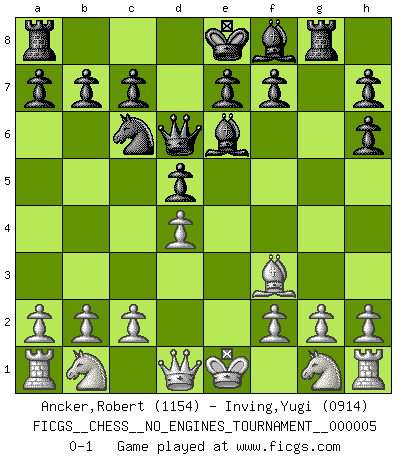 Last move : 0-1 2008 March 30 18:37:57 [Event "FICGS__CHESS__NO_ENGINES_TOURNAMENT__000005"] [Site "FICGS"] [Date "2008.02.16"] [Round "1"] [White "Ancker,Robert"] [Black "Inving,Yugi"] [Result "0-1"] [WhiteElo "1154"] [BlackElo "0914"] 1.e4 d5 2.e5 Nh6 3.d4 Nc6 4.e6 Bxe6 5.Bxh6 gxh6 6.Be2 Rg8 7.Bf3 Qd6 0-1 This chess game has been lost on time (started : 2008.02.16 20:25:17) Scandinavian (centre counter) defense Player Black won this chess game. Follow this game move after move (download)Good positions don't win games, good moves do. (Gerald Abrahams) Wie ich sie so einen nach dem anderen nieder mähte wurde meine Überlegenheit offensichtlich. (José Raúl Capablanca) El Ajedrez es una hermosa aventura. (Bent Larsen) Je crois qu'il existe des manières très spécifiques de jouer efficacement contre une machine. Evidemment, nous n'avons aucune chance en technique pure, parce que l'ordinateur calcule de manière parfaite. Mais lorsque nous faisons appel à notre cerveau, en utilisant l'intuition et la compréhension, alors nous restons beaucoup plus forts. (Anatoli Karpov) A clear conscience is usually the sign of a bad memory. (Unknown)