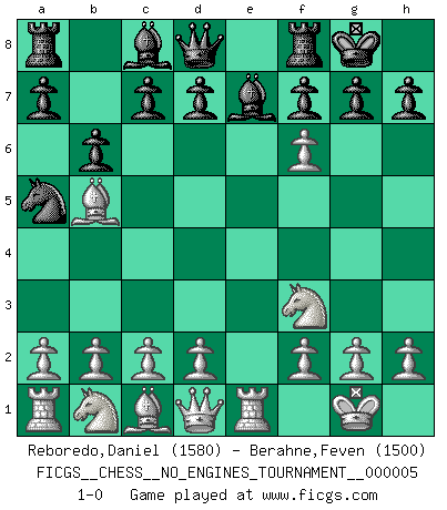 Last move : 1-0 2008 April 3 6:52:25 [Event "FICGS__CHESS__NO_ENGINES_TOURNAMENT__000005"] [Site "FICGS"] [Date "2008.02.16"] [Round "1"] [White "Reboredo,Daniel"] [Black "Berahne,Feven"] [Result "1-0"] [WhiteElo "1580"] [BlackElo "1500"] 1.e4 e5 2.Nf3 Nc6 3.Bb5 Na5 4.O-O b6 5.Re1 Nf6 6.Nxe5 Bd6 7.Nf3 O-O 8.e5 Be7 9.exf6 1-0 This chess game has been lost on time (started : 2008.02.16 20:25:17) Ruy Lopez : Pollock defense Kingside Castling by player White (move 4) Kingside Castling by player Black (move 7) Player White won this chess game. Follow this game move after move (download)Fischer prefers to enter Chess history alone. (Miguel Najdorf) Lisa Lane, amerikanische Schachmeisterin, hatte Fischer einmal als stärksten lebenden Spieler bezeichnet. Antwort: Das ist richtig, aber Lisa Lane ist eigentlich nicht in der Lage, das zu beurteilen. (Robert James Fischer) Repentinamente, me resultaba obvio en mi analisis que yo había pasado por alto lo que Fischer había visto en el tablero con la mas grande facilidad. (Mikhail Botvinnik) Une platitude souvent récitée à propos des Echecs est qu'une des choses les plus difficiles à réaliser est de gagner une position gagnante. Cela ne manque pas de sens mais, pour ma part, j'ai toujours trouvé plus difficile de gagner une position perdante. (Tim Krabbe) The only sure thing about luck is that it will change. (Wilson Mizner)