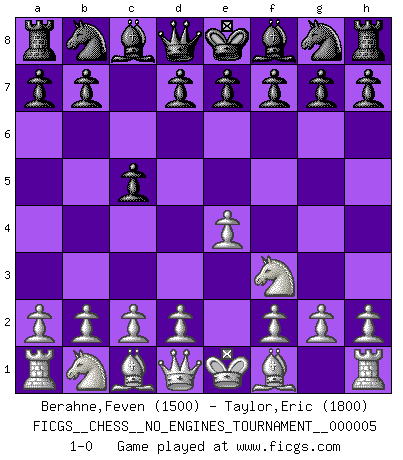 Last move : 1-0 2008 April 8 7:12:54 [Event "FICGS__CHESS__NO_ENGINES_TOURNAMENT__000005"] [Site "FICGS"] [Date "2008.02.16"] [Round "1"] [White "Berahne,Feven"] [Black "Taylor,Eric"] [Result "1-0"] [WhiteElo "1500"] [BlackElo "1800"] 1.e4 c5 2.Nf3 1-0 This chess game has been lost on time (started : 2008.02.16 20:25:17) Sicilian defense Player White won this chess game. Follow this game move after move (download)Alekhine is a poet who creates a work of art out of something that would hardly inspire another man to send home a picture post card. (Max Euwe) Bobby Fischer ist kein Vorbild für die heutige Jugend. (Viktor Kortschnoi) Robert Fischer es la ley hacia si mismo. (Larry Evans) Tout change constamment, y compris dans le monde des Echecs. (Botvinnik) The quality of decision is like the well-timed swoop of a falcon which enables it to strike and destroy its victim. (Sun Tzu)