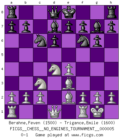 Last move : 0-1 2008 April 6 7:3:51 [Event "FICGS__CHESS__NO_ENGINES_TOURNAMENT__000005"] [Site "FICGS"] [Date "2008.02.16"] [Round "1"] [White "Berahne,Feven"] [Black "Trigance,Emile"] [Result "0-1"] [WhiteElo "1500"] [BlackElo "1600"] 1.e4 c5 2.Nf3 d6 3.Be2 Nc6 4.O-O Nf6 5.d4 cxd4 6.Nxd4 g6 7.Nc3 Bd7 8.Be3 Bg7 0-1 This chess game has been lost on time (started : 2008.02.16 20:25:17) Sicilian Kingside Castling by player White (move 4) Player Black won this chess game. Follow this game move after move (download)Chess is really ninety nine percent calculation. (Soltis) Kann Schach nicht schließlich das Nationalspiel der Deutschen werden? Und welche weiteren Ausblicke bieten sich dann dar! Welche Hebung des allgemeinen Kultur-Niveaus, ja der Moral, wenn das Schachbrett den Kartentisch verdrängen würde! Wahrlich, ein Ziel, des Schweißes der Edlen wert! (Siegbert Tarrasch) El Ajedrez era la lengua materna de Capablanca. (Reti) Il s'avisa de me proposer d'apprendre les échecs qu'il jouait un peu... me voilà forcené des échecs. J'achète un échiquier, je m'enferme dans ma chambre, j'y passe des jours et des nuits à vouloir apprendre par cur toutes les parties. (Jean-Jacques Rousseau, Confessions) Be who you are, and say what you feel because those who mind don't matter, and those who matter don't mind. (Dr Seuss)