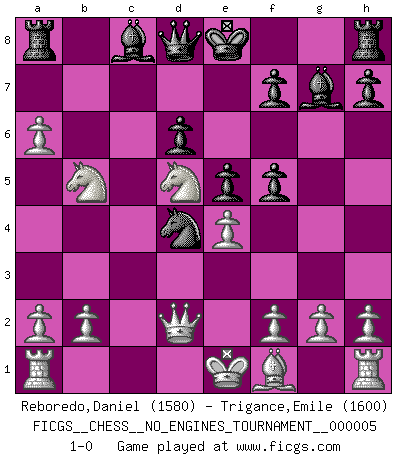 Last move : 1-0 2008 March 3 16:57:43 [Event "FICGS__CHESS__NO_ENGINES_TOURNAMENT__000005"] [Site "FICGS"] [Date "2008.02.16"] [Round "1"] [White "Reboredo,Daniel"] [Black "Trigance,Emile"] [Result "1-0"] [WhiteElo "1580"] [BlackElo "1600"] 1.e4 c5 2.Nf3 Nc6 3.d4 cxd4 4.Nxd4 Nf6 5.Nc3 e5 6.Ndb5 d6 7.Bg5 a6 8.Na3 b5 9.Bxf6 gxf6 10.Nd5 f5 11.c4 Bg7 12.cxb5 Nd4 13.bxa6 Qa5+ 14.Qd2 Qd8 15.Nb5 1-0 Sicilian : Pelikan (Lasker/Sveshnikov) variation Player White won this chess game. Follow this game move after move (download)The game of Chess is not merely an idle amusement; several very valuable qualities of the mind are to be acquired and strengthened by it, so as to become habits ready on all occasions; for life is a kind of Chess. (Benjamin Franklin) Ich habe Kasparov in Rente geschickt. (Veselin Topalov) El Ajedrez por encima de todo... ¡es una pelea!. (Emanuel Lasker) Un footballeur joue avec ses pieds, parfois avec sa tête. Un joueur d'échecs ne joue qu'avec sa tête. Et quand il ne joue plus, il meurt. (Jacob Murray) Players are not good because they find tactics, it is about the way to find the positions in which those tactics are hidden. (Luc-Olivier Leclerc)