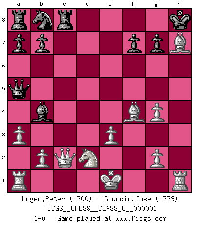 Last move : 1-0 2006 April 23 22:47:17 [Event "FICGS__CHESS__CLASS_C__000001"] [Site "FICGS"] [Date "2006.04.13"] [Round "1"] [White "Unger,Peter"] [Black "Gourdin,Jose"] [Result "1-0"] [WhiteElo "1700"] [BlackElo "1779"] 1.d4 d5 2.Nf3 Nf6 3.c4 e6 4.Nc3 Be7 5.Bf4 O-O 6.e3 c5 7.dxc5 Bxc5 8.cxd5 Nxd5 9.Nxd5 exd5 10.a3 Bg4 11.Bd3 d4 12.Qc2 Qa5+ 13.Nd2 dxe3 14.fxe3 Bb4 15.Bxh7+ Kh8 16.h3 Rc8 17.hxg4 1-0 Queen's pawn game Kingside Castling by player Black (move 5) Player White won this chess game. Follow this game move after move (download)The defensive power of a pinned piece is only imaginary. (Aaron Nimzovich) Frage: Wie viele Autos haben Sie schon zerstört? - Antwort: Nur zwei. (Loek van Wely) Un entendimiento a fondo de las continuaciones típicas del mate, hace de las combinaciones de sacrificio mas complicadas conducirlas a ellas no solo sin dificultad, sino casi de una manera natural. (Siegbert Tarrasch) Soyez une menace à chaque fois que vous vous asseyez pour jouer. (Ken Smith) Life is like a ten-speed bicycle: most of us have gears we never use. (Charles M. Schulz)