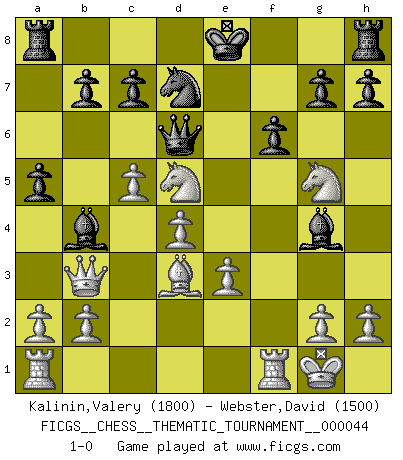 Last move : 1-0 2008 June 30 13:54:43 [Event "FICGS__CHESS__THEMATIC_TOURNAMENT__000044"] [Site "FICGS"] [Date "2008.02.18"] [Round "1"] [White "Kalinin,Valery"] [Black "Webster,David"] [Result "1-0"] [WhiteElo "1800"] [BlackElo "1500"] 1.e4 d5 2.exd5 Nf6 3.c4 e6 4.dxe6 Bxe6 5.Nf3 Bc5 6.d4 Bb4+ 7.Nc3 Qe7 8.Be3 Ng4 9.Bd3 Nd7 10.O-O Nxe3 11.fxe3 Bg4 12.Nd5 Qd6 13.Qb3 a5 14.Ng5 f6 15.c5 1-0 This chess game has been lost on time (started : 2008.02.18 13:27:45) Scandinavian : Icelandic gambit Kingside Castling by player White (move 10) Player White won this chess game. Follow this game move after move (download)When the Chess game is over, the Pawn and the King go back to the same box. (Irish saying) Frage: Wie viele Autos haben Sie schon zerstört? - Antwort: Nur zwei. (Loek van Wely) Ciertamente, de todas la drogas del mundo, el Ajedrez debe ser el mas placentero permamentemente. (Assiac) Je ne suis pas le dernier à jouer lâchement des coups douteux pendant le zeïtnot de l'adversaire pour l'achever: en effet les coups qui font le plus peur sont ceux que l'on ne comprend pas. Je me fais souvent peur quand je joue. (Un professeur anonyme) Live, lose, and learn, by observing your opponent how to win. (Amber Steenbock)