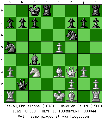 Last move : 0-1 2008 March 26 12:52:30 [Event "FICGS__CHESS__THEMATIC_TOURNAMENT__000044"] [Site "FICGS"] [Date "2008.02.18"] [Round "1"] [White "Czekaj,Christophe"] [Black "Webster,David"] [Result "0-1"] [WhiteElo "1873"] [BlackElo "1500"] 1.e4 d5 2.exd5 Nf6 3.c4 e6 4.dxe6 Bxe6 5.Nf3 Qe7 6.Qe2 Nc6 7.d4 Qb4+ 8.Nc3 O-O-O 9.Be3 Na5 10.Ne5 Bd6 11.a3 Qb3 12.g3 Bxe5 13.dxe5 Bxc4 14.Qf3 Qxb2 0-1 Scandinavian : Icelandic gambit Queenside Castling by player Black (move 8) Player Black won this chess game. Follow this game move after move (download)Chess is a part of culture and if a culture is declining then Chess too will decline. (Mikhail Botvinnik) Das Schachspiel hat wie die Liebe, die Musik, die Fähigkeit, den Menschen glücklich zu machen. Ich habe ein leises Gefühl des Bedauerns für jeden, der das Schachspiel nicht kennt, so wie ich jeden bedaure, der die Liebe nicht kennt. (Siegbert Tarrasch) ¿Quién es tu oponente esta tarde? Esta tarde mi oponente son las piezas negras. (Akiba Rubinstein) Les échecs sont utiles à l'exercice de la faculté de penser et à celle de l'imagination. Car nous devons posséder une méthode élaborée pour atteindre des buts partout où nous devons conduire notre raison. (Leibnitz) A specialist learns more and more about less and less until he knows everything about nothing. (Nicholas Murray Butler)