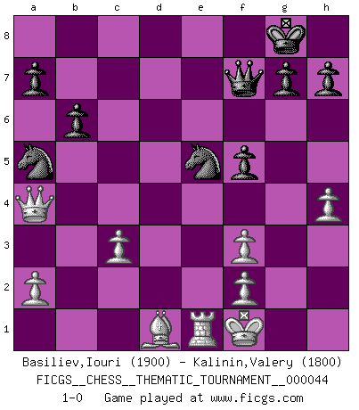 Last move : 1-0 2008 May 28 11:45:43 [Event "FICGS__CHESS__THEMATIC_TOURNAMENT__000044"] [Site "FICGS"] [Date "2008.02.18"] [Round "1"] [White "Basiliev,Iouri"] [Black "Kalinin,Valery"] [Result "1-0"] [WhiteElo "1900"] [BlackElo "1800"] 1.e4 d5 2.exd5 Nf6 3.c4 e6 4.dxe6 Bxe6 5.Nf3 Nc6 6.d4 Bb4+ 7.Nc3 Ne4 8.Bd2 Bxc3 9.bxc3 Qe7 10.Be3 Bg4 11.Bd3 O-O 12.d5 Na5 13.O-O b6 14.Re1 f5 15.h3 Bh5 16.Qa4 Bxf3 17.gxf3 Ng5 18.Kg2 Qf6 19.c5 Rad8 20.h4 Nf7 21.d6 Qg6+ 22.Kf1 Ne5 23.Be2 Qf7 24.Bg5 cxd6 25.Bxd8 Rxd8 26.cxd6 Rxd6 27.Rad1 Rxd1 28.Bxd1 1-0 Scandinavian : Icelandic gambit Kingside Castling by player Black (move 11) Kingside Castling by player White (move 13) Player White won this chess game. Follow this game move after move (download)What is the difference between chess and football? Everybody understands football, but nobody plays it. Everybody plays chess, but nobody understands it. Everything is relative. (Vladimir Kramnik) Mutter, ich bin eben Ex-Weltmeister geworden. --beim nach Hause Kommen nach dem Verlust des WM-Titels an Mihail Botvinnik -- (Mikhail Nekhemyevich Tal) Hay dos clases de hombres: aquellos que se conforman en dejarse llevar por las circunstancias y que juegan barajas y aquellos decididos a controlar las circunstancias y que juegan al Ajedrez. (Mortimer Collins) On est toujours la mazette de quelqu'un d'autre. (Anonyme) Wipe them out. All of them. (Darth Sidious in Star Wars ep.1)