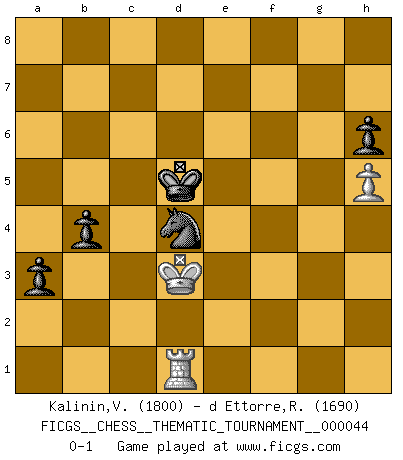 Last move : 0-1 2008 October 27 18:33:38 [Event "FICGS__CHESS__THEMATIC_TOURNAMENT__000044"] [Site "FICGS"] [Date "2008.02.18"] [Round "1"] [White "Kalinin,Valery"] [Black "d Ettorre,Rodolfo"] [Result "0-1"] [WhiteElo "1800"] [BlackElo "1690"] 1.e4 d5 2.exd5 Nf6 3.c4 e6 4.dxe6 Bxe6 5.Nf3 Nc6 6.d4 Bb4+ 7.Nc3 Ne4 8.Bd2 Bxc3 9.bxc3 Qe7 10.Be3 O-O-O 11.d5 Bg4 12.Bd3 Nc5 13.O-O Ne5 14.Be2 Bxf3 15.Bxf3 Nxc4 16.Bd4 Rhe8 17.Re1 Qf8 18.Qc2 g6 19.Be2 Nb6 20.c4 f5 21.Rab1 Kb8 22.Rb5 Nbd7 23.Reb1 Qd6 24.Bf3 Re7 25.Be3 Rde8 26.g3 b6 27.Qc3 a6 28.R5b4 Ne5 29.Be2 Ka7 30.a4 Ned7 31.a5 Rxe3 32.fxe3 Qe7 33.axb6+ cxb6 34.Ra1 Qxe3+ 35.Qxe3 Rxe3 36.Bf1 Kb7 37.Rb2 Kc7 38.Re2 Re5 39.Rxe5 Nxe5 40.Be2 a5 41.Kf2 Nb3 42.Ra4 Nd4 43.Ke3 Nxe2 44.Kxe2 Kd6 45.h3 Kc5 46.Ke3 g5 47.h4 h6 48.Kd2 f4 49.gxf4 gxf4 50.h5 f3 51.Ke3 Kd6 52.Kd4 f2 53.Ra1 Ng4 54.Rf1 a4 55.Kd3 a3 56.Ke2 Nh2 57.c5+ Kxc5 58.Rc1+ Kxd5 59.Kxf2 b5 60.Ke2 b4 61.Kd3 Nf3 62.Rd1 Nd4 0-1 Scandinavian : Icelandic gambit Queenside Castling by player Black (move 10) Kingside Castling by player White (move 13) 10 pieces endgame at move 57 : White KRPP , Black KNPPPP WHITE : King + 1 Rook 2 Pawns BLACK : King + 1 Knight 4 Pawns 9 pieces endgame at move 58 : White KRP , Black KNPPPP WHITE : King + 1 Rook 1 Pawn BLACK : King + 1 Knight 4 Pawns 8 pieces endgame at move 59 : White KRP , Black KNPPP WHITE : King + 1 Rook 1 Pawn BLACK : King + 1 Knight 3 Pawns Player Black won this chess game. Follow this game move after move (download)Chess books should be used as we use glasses: to assist the sight, although some players make use of them as if they thought they conferred sight. (Jose Raul Capablanca) Alles was am Schachbrett zählt sind gute Züge. (Robert James Fischer) Dios mío, Bobby Fischer juega tan simple. (Alexei Suetin) Les Echecs sont et restent toujours un combat, un combat intégral comme la boxe, la lutte ou un autre sport, et où il doit y avoir un vainqueur et un vaincu. (Joseph Emil Diemer) Inventor: A person who makes an ingenious arrangement of wheels, levers and springs, and believes it civilization. (Ambrose Bierce, The Devil's Dictionary)