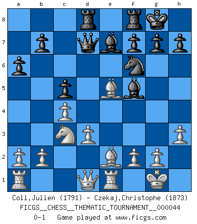 Last move : 0-1 2008 June 13 0:9:6 [Event "FICGS__CHESS__THEMATIC_TOURNAMENT__000044"] [Site "FICGS"] [Date "2008.02.18"] [Round "1"] [White "Coll,Julien"] [Black "Czekaj,Christophe"] [Result "0-1"] [WhiteElo "1791"] [BlackElo "1873"] 1.e4 d5 2.exd5 Nf6 3.c4 e6 4.dxe6 Bxe6 5.Nf3 c5 6.Be2 Nc6 7.d3 Be7 8.O-O O-O 9.Nc3 a6 10.Re1 Qd7 11.Be3 Ng4 12.Bf4 Rad8 13.h3 Nf6 14.Ne5 Nxe5 15.Bxe5 Bf5 0-1 This chess game has been lost on time (started : 2008.02.18 13:27:45) Scandinavian : Icelandic gambit Kingside Castling by player White (move 8) Kingside Castling by player Black (move 8) Player Black won this chess game. Follow this game move after move (download)A win by an unsound combination, however showy, fills me with artistic horror. (Wilhelm Steinitz) Sehr viele beherrschen heutzutage das große Einmalseins des Schachspiels und kennen sogar dessen Logarithmentafeln auswendig - deshalb sollte man hin und wieder zu beweisen trachten, dass zwei mal zwei auch fünf sein kann. (Mikhail Nekhemyevich Tal) Coloca el contenido del tablero de Ajedrez en un sombrero, agita las piezas vigorosamente, derrámalas en el tablero desde una altura de medio metro y así obtienes el estilo de Wilhelm Steinitz. (H. E. Bird) On a dit que l'homme se distingue de l'animal par le fait qu'il achète plus de livres qu'il ne peut en lire. Je voudrais suggérer qu'inclure à la liste des livres quelques livres d'échecs rendrait la distinction manifeste. (Edward Lasker) Coffee just isn't my cup of tea. (Unknown)